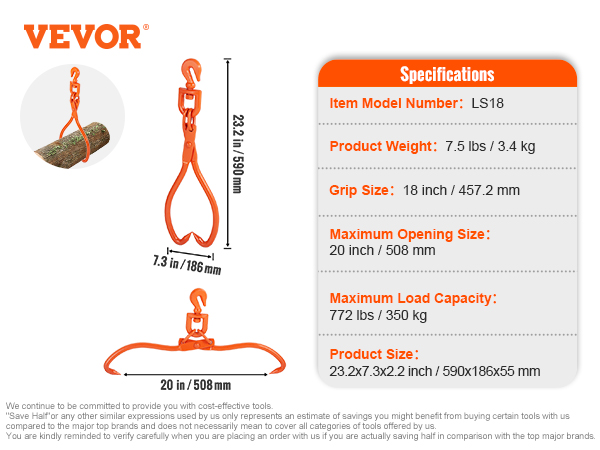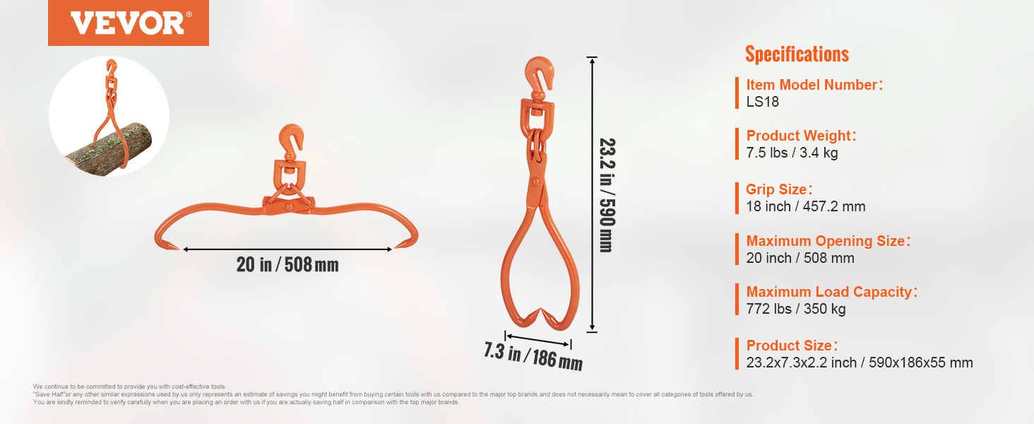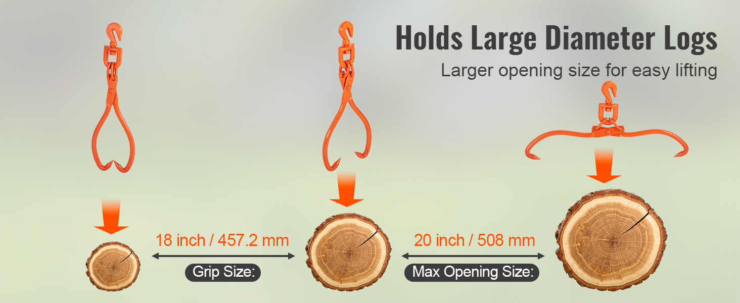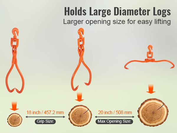 Maksimiavauma on 20 inch ja tartuntakoko 18 inch, joten kahmarit sopivat monenlaisten suurten runkojen käsittelyyn. Niitä voi käyttää myös esimerkiksi heinäpaalien, kaapeleiden, kivien ja muiden raskaiden kappaleiden siirtämiseen.