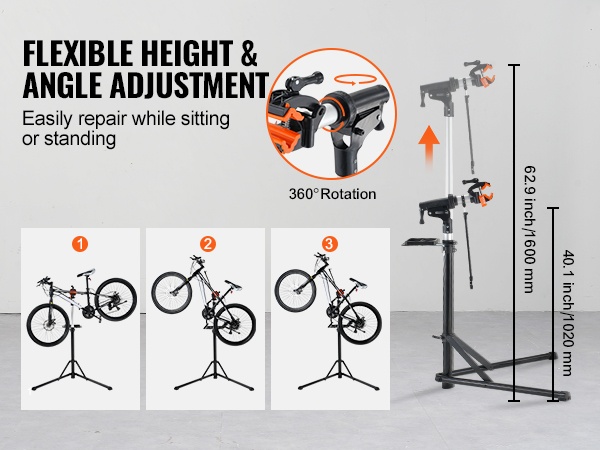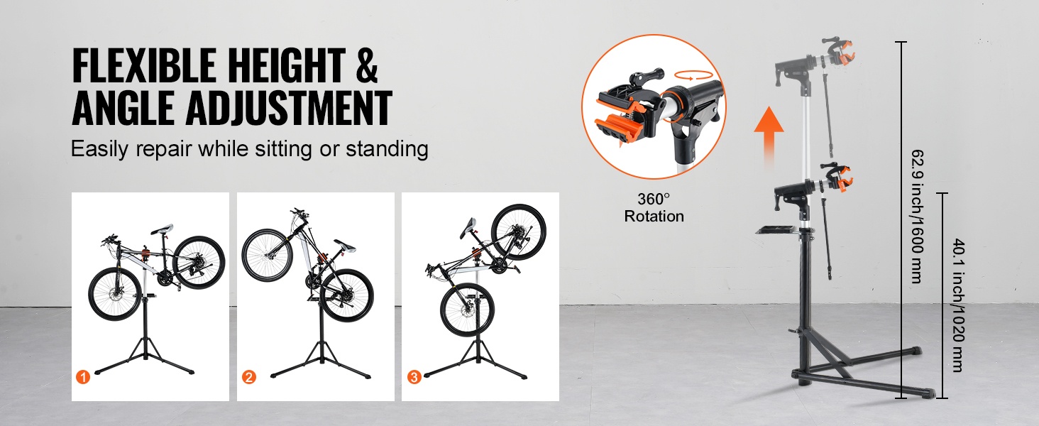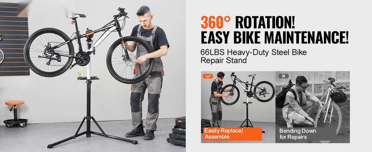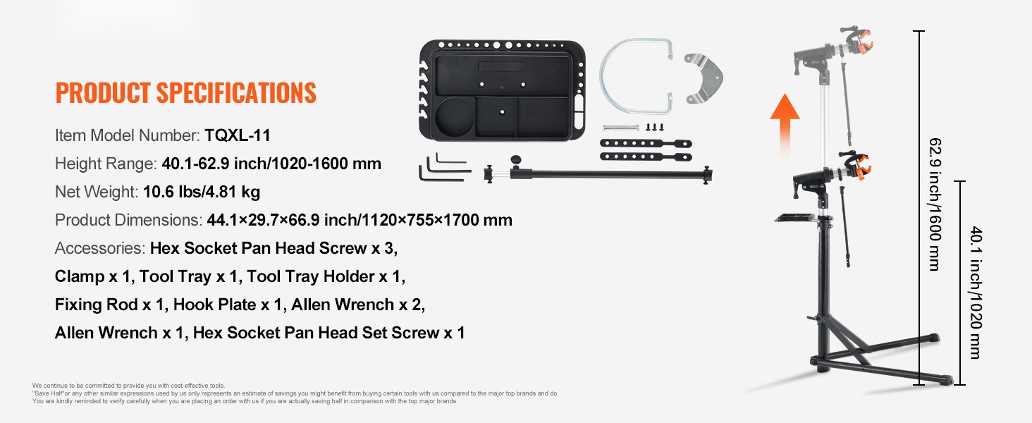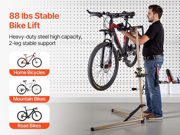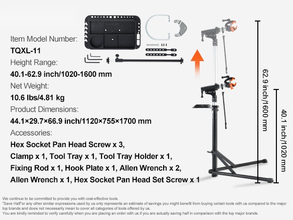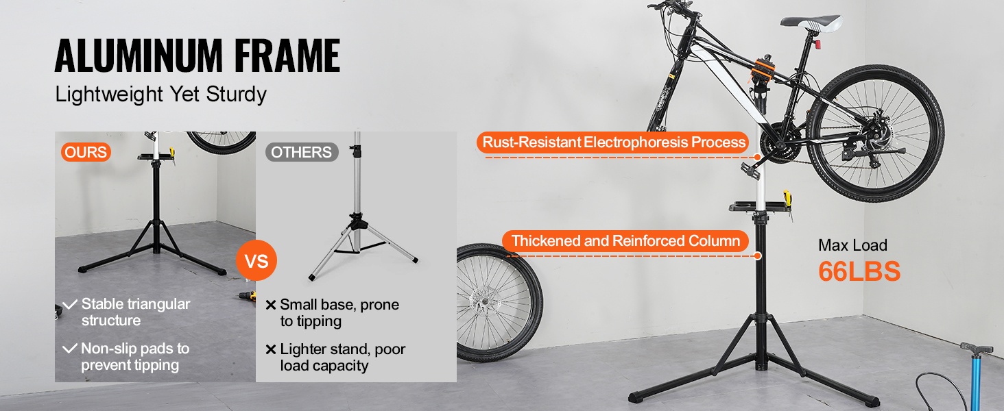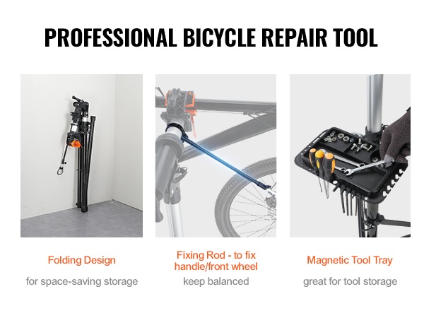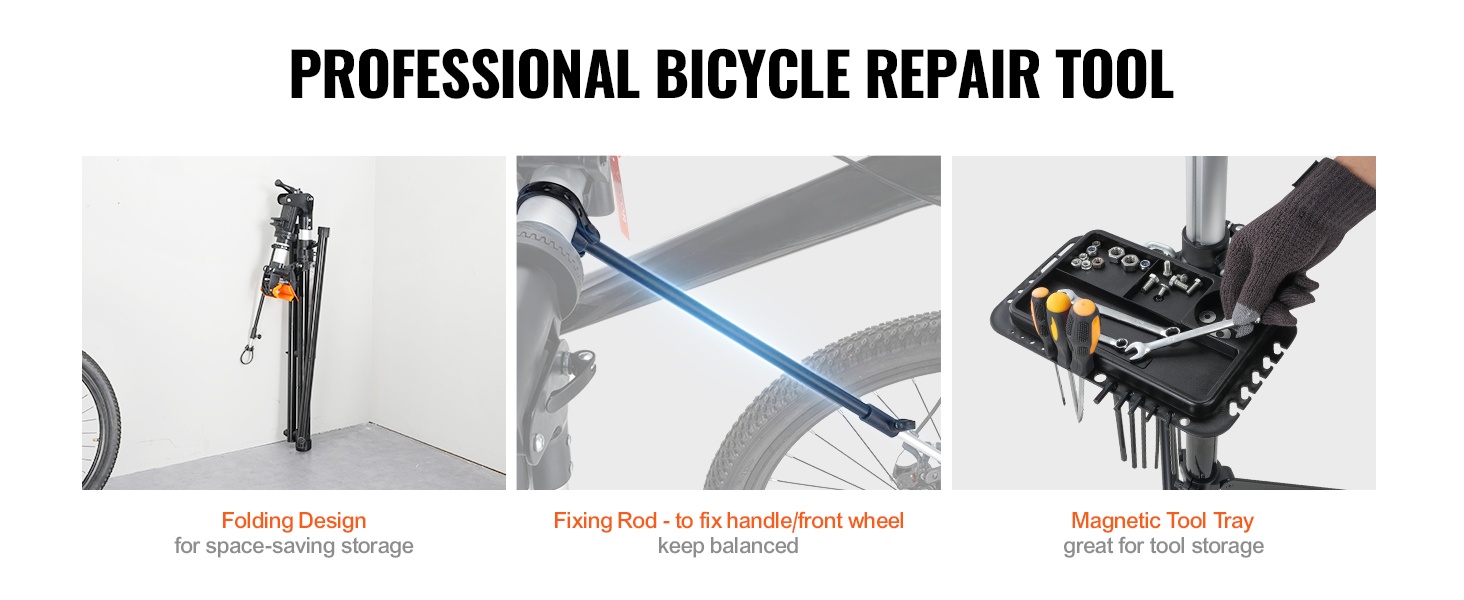 Huoltoteline on valmistettu kestävästä Q195-teräksestä, ja 4-jalkainen rakenne lisää vakautta erilaisilla alustoilla. Mukana tuleva etupyörän stabilointitanko ja magneettinen työkalutarjotin pitävät pyörän ja työkalut hyvin hallinnassa huollon aikana.