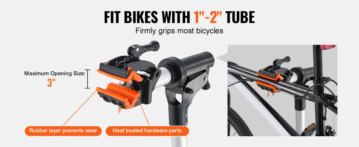 Säädettävä puristin, jossa on pehmeä kumivuoraus, tarttuu turvallisesti erikokoisiin runkoputkiin. Materiaalit on suunniteltu kestämään taipumista ja murtumista, jotta teline pysyy luotettavana pitkään.