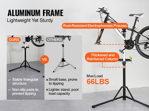 Tämä pyörän huoltoteline helpottaa ketjujen puhdistusta, vaihteiden säätöä ja muita huoltotöitä kotona tai verstaalla. Tukevan 4-jalkaisen rakenteen ja enintään 66 lbs (29.9 kg) kantavuuden ansiosta se soveltuu hyvin maasto- ja maantiepyörille sekä kotikäyttöön.