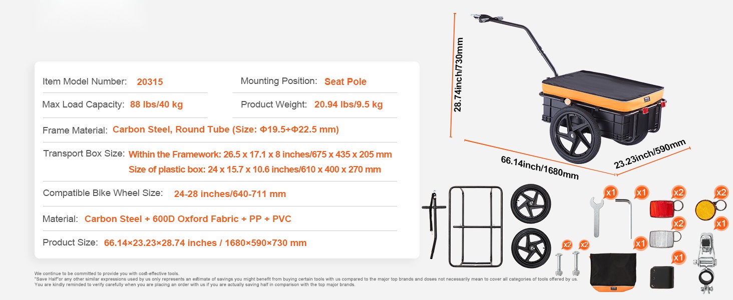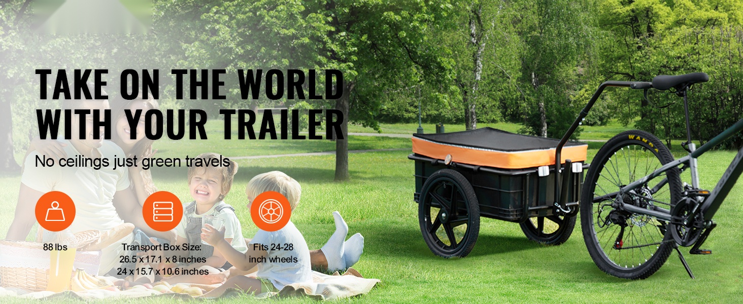 Tämä pyörän tavaraperäkärry kuljettaa jopa 100 lbs painon. Tilaa riittää esimerkiksi leirintävarusteille, matkatavaroille tai päivittäisille ostoksille. Kärry sopii polkupyöriin, joiden renkaiden koko on 22–28 tuumaa, joten se on helppo yhdistää useimpiin pyöriin.