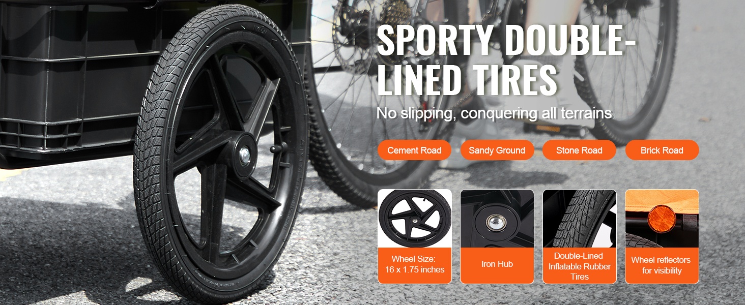 Sporttiset renkaat ja tukevat rautaiset navat pitävät ajon vakaana niin asfaltilla kuin hiekkateillä. Peräkärry seuraa pyörää luotettavasti, mikä lisää ajomukavuutta ja turvallisuutta.
