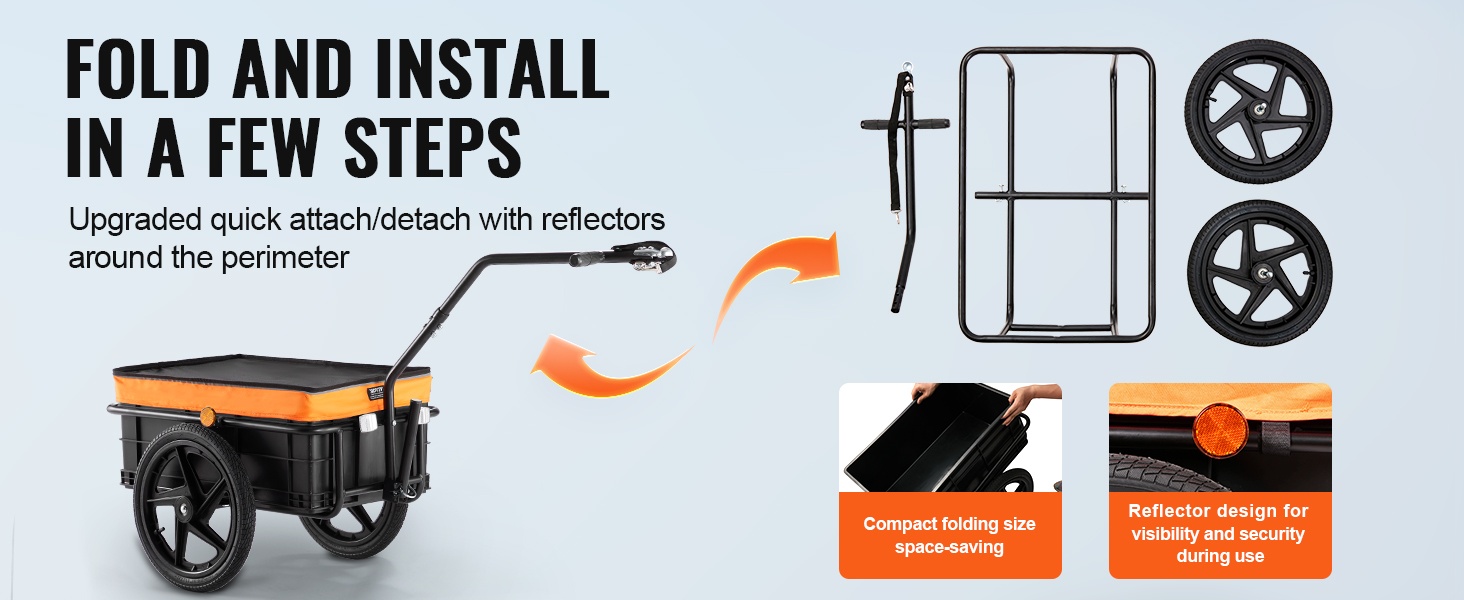 Taittuva runko ja pikalukitusjärjestelmä tekevät käyttöönotosta ja säilytyksestä nopeaa. Peräkärry on helppo taittaa kasaan, kun sitä ei tarvita. Heijastintarrat parantavat näkyvyyttä ja turvallisuutta hämärässä ajaessa.