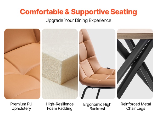 PU-nahkatuolit ovat vedenkestävät, kulutusta kestävät ja helppo pyyhkiä puhtaaksi. Korkealaatuinen, kimmoisa vaahtopehmuste pysyy pehmeänä painumatta kasaan, ja ergonomisesti muotoiltu korkea selkänoja tukee selkärankaa. Lujat metallijalat tarjoavat staattisen kantavuuden 330 lbs / 149.7 kg per tuoli, joten tuolit sopivat hyvin päivittäiseen käyttöön.
