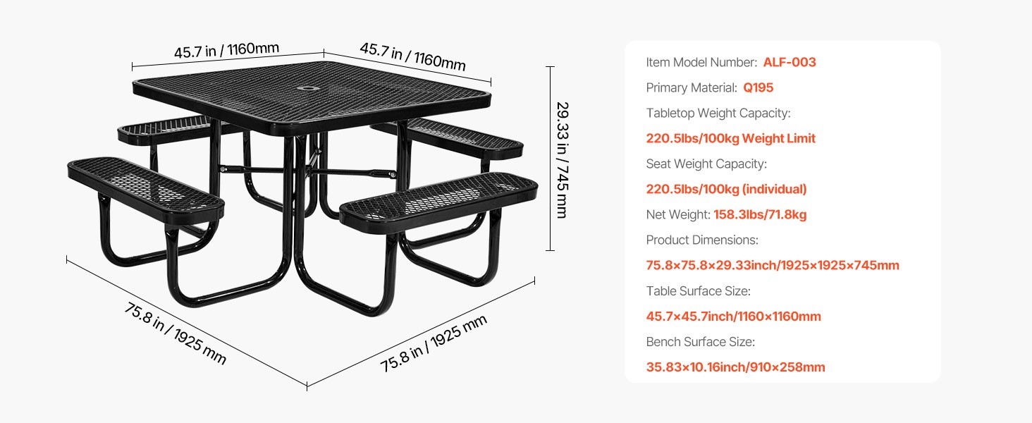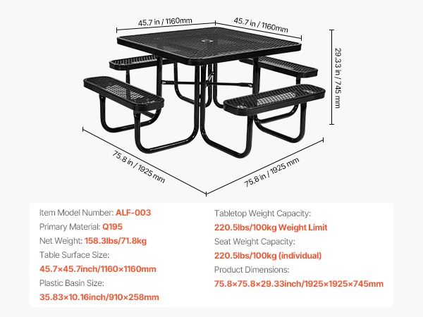 - Pöytälevyn koko: 45.3 x 45.3 in / 1150 x 1150 mm