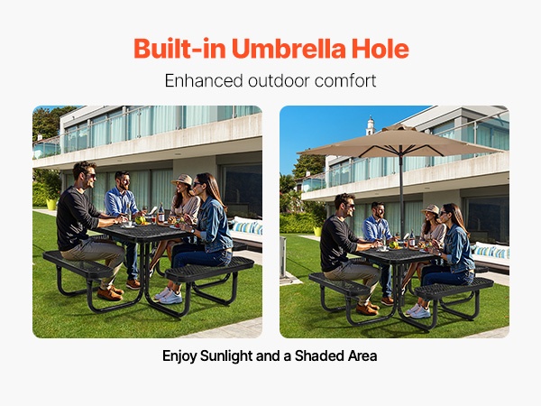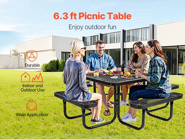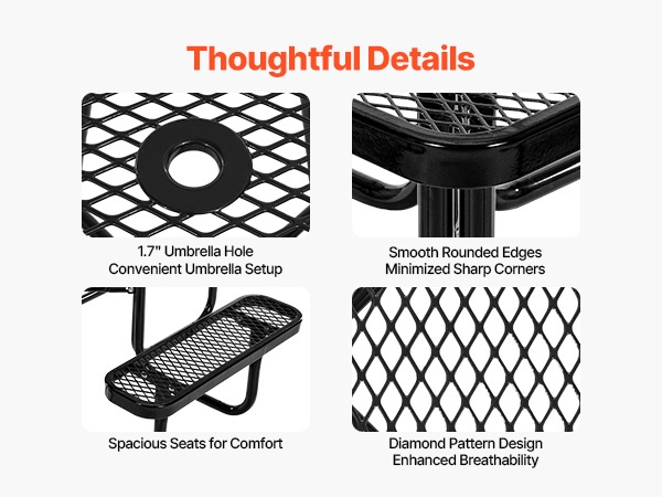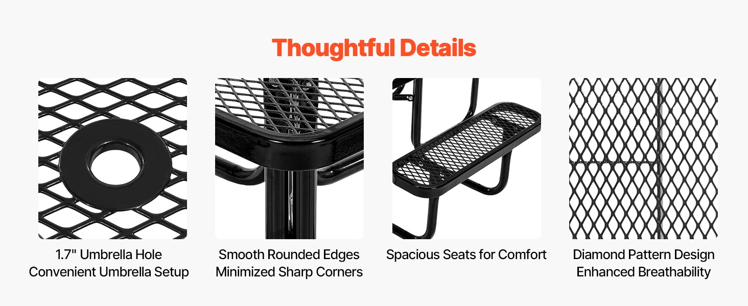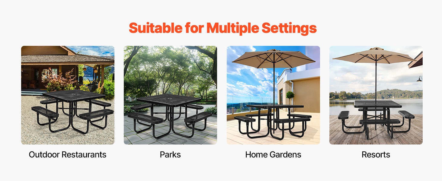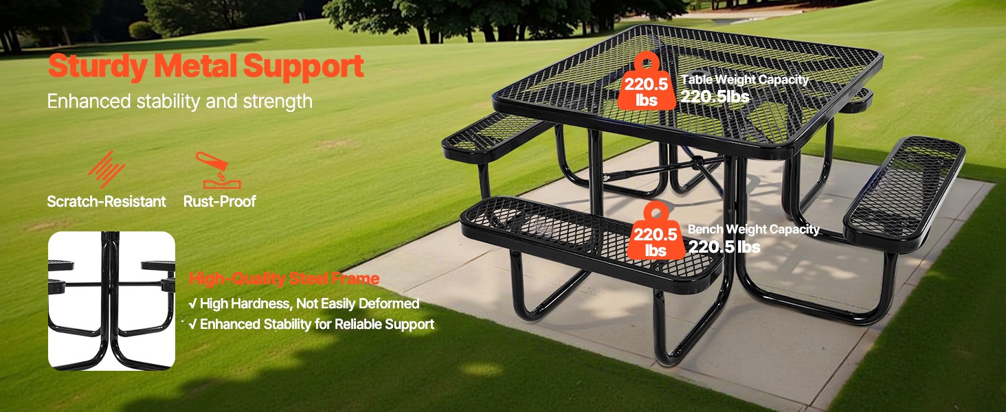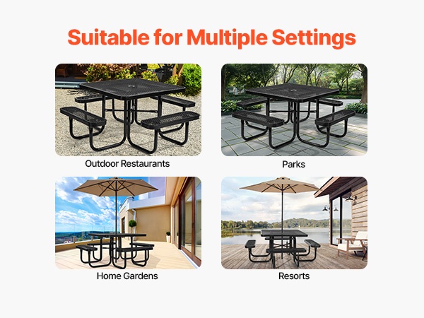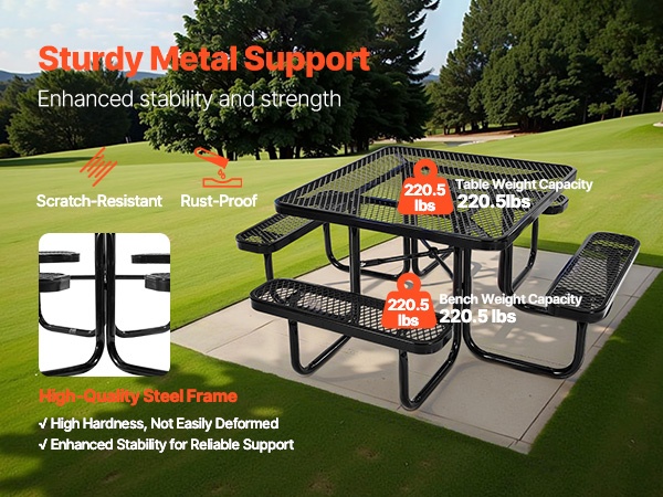 Pyöreä 46-tuuman piknikpöytä ja penkkisarja pinnoitettu teräsrunko ulkokäyttöön