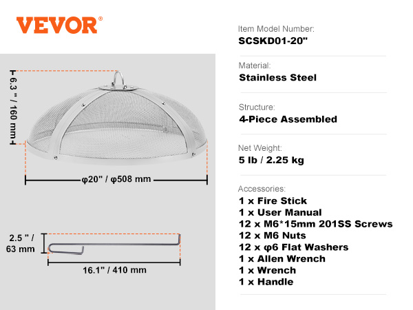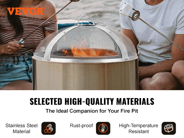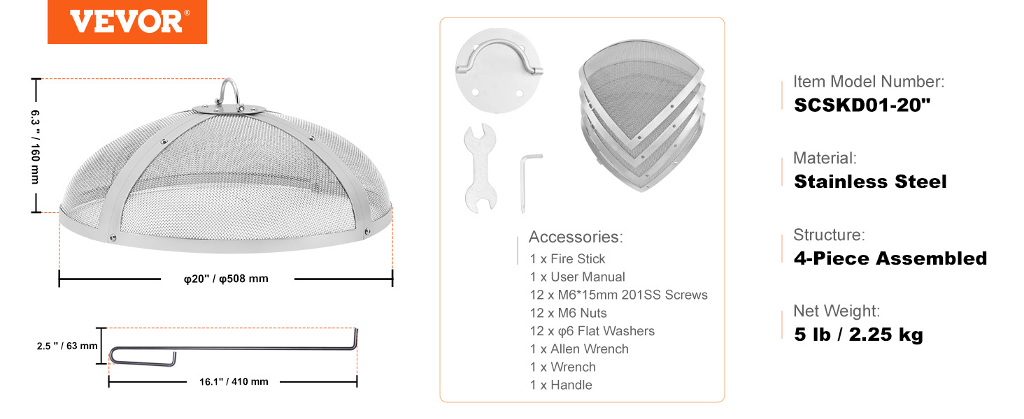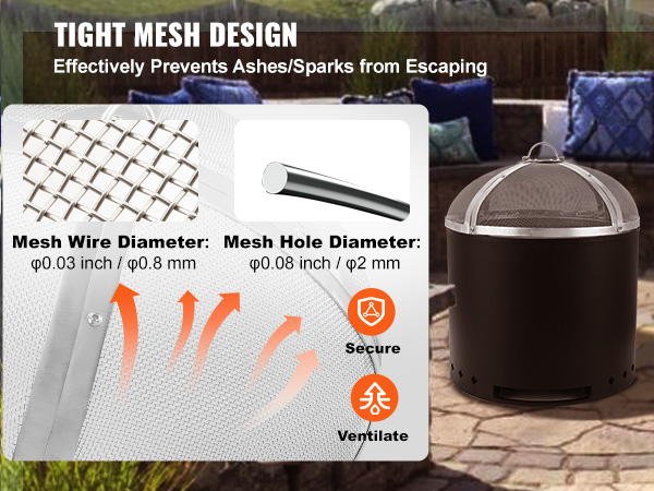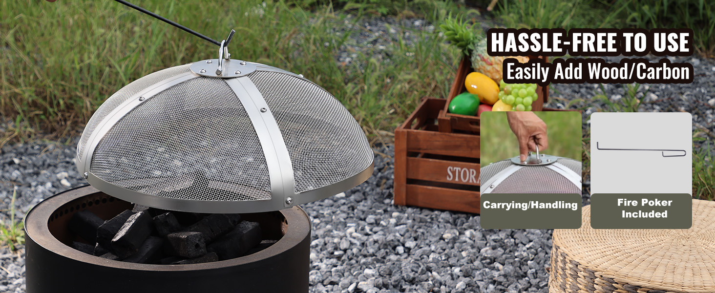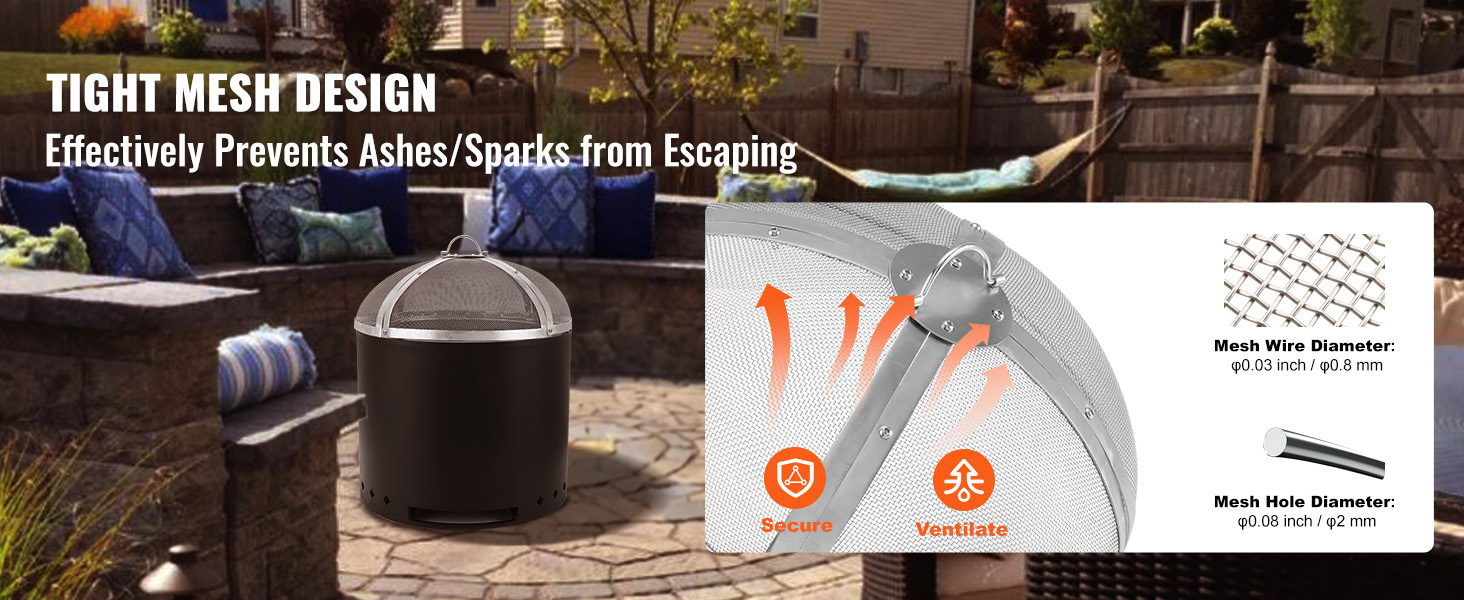 Tämä ruostumattomasta teräksestä valmistettu pyöreä kipinäsuoja ja kansi auttaa tekemään ulkotakan käytöstä turvallisempaa ja siistimpää. Tiheä metalliverkko pysäyttää kipinät ja tuhkan, mutta päästää ilman läpi, jotta tuli palaa tasaisesti. Kansi sopii useimpiin noin 20-tuumaisiin pyöreisiin tulipesiin ja terassitakkoihin.