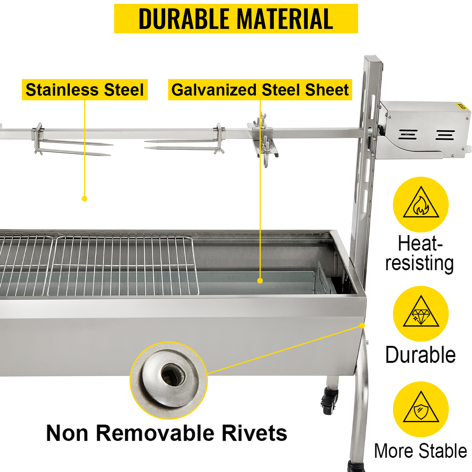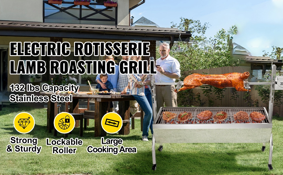 Tämä pyörivä grillipaistovaunu soveltuu sekä kotipihalle että tapahtumiin, joissa halutaan valmistaa kokonaisia lihoja, kuten karitsaa, porsasta tai kalkkunaa, sekä muuta grillattavaa. Tukevan rungon, sähkömoottorin ja suuren grillauspinnan ansiosta useita ruokia voidaan kypsentää samanaikaisesti. Säädettävä vartaan korkeus ja lukittavat pyörät helpottavat käyttöä ulkokäytössä.Ominaisuudet: