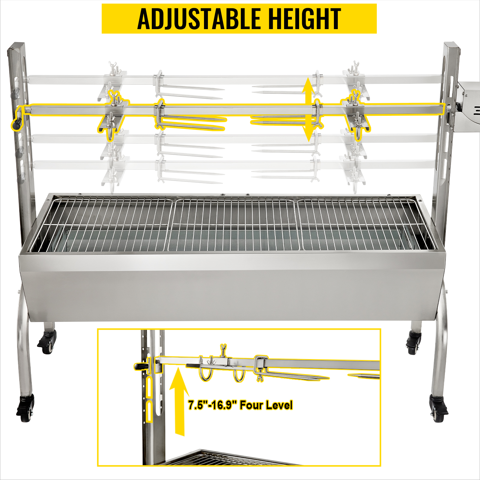 Sähköinen vartaalla pyörivä grilli, ruostumaton teräs, 52W moottori, korkeus säädettävä ulkokäyttöön