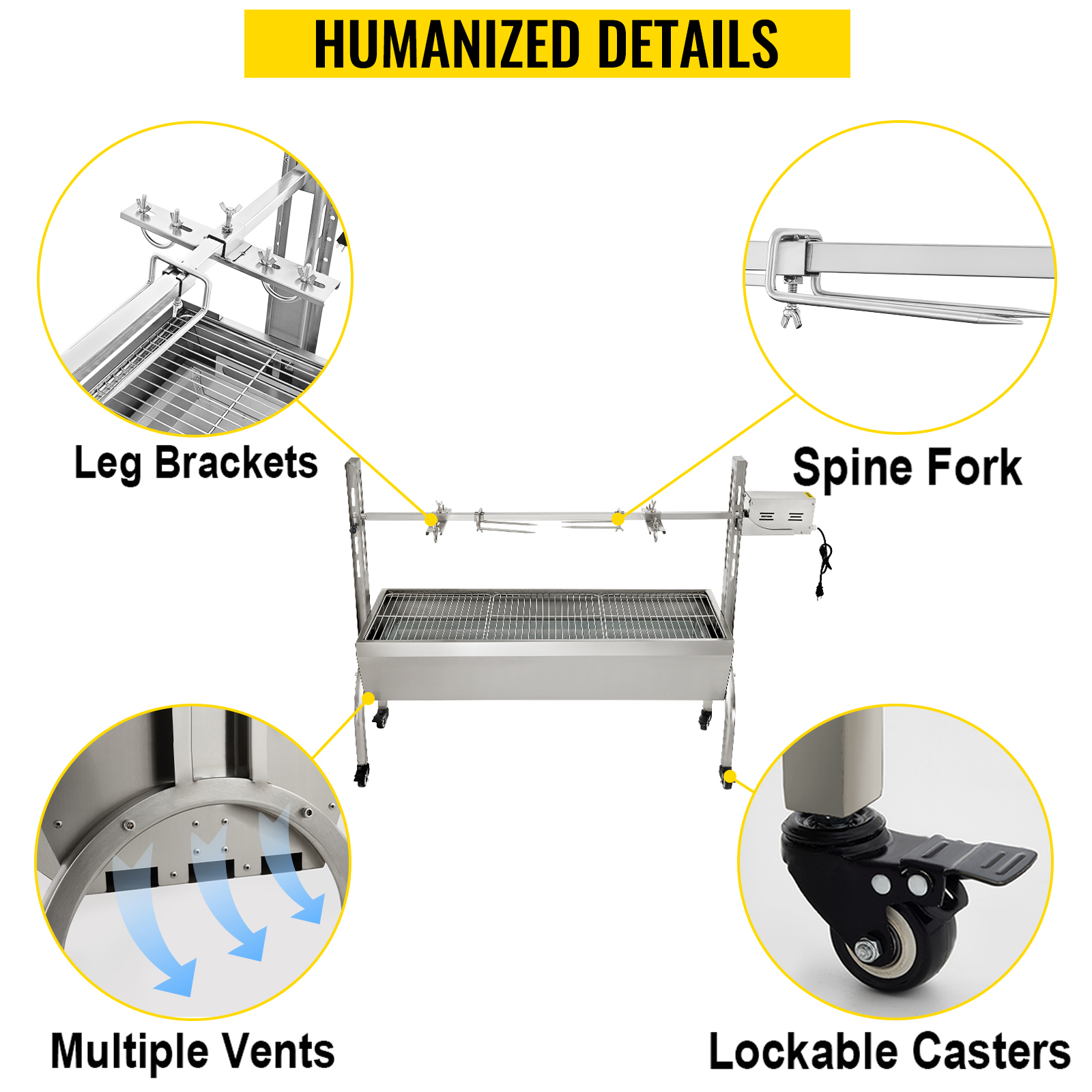 Grillivaunussa on lukittavat pyörät, useita jäähdytysaukkoja, tukijalat ja selkärankapiikit ruoan kiinnittämistä varten. Nämä yksityiskohdat parantavat turvallisuutta, käyttömukavuutta ja vartaan tasapainoa paiston aikana.
