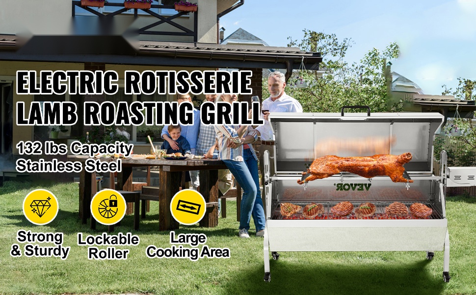 Tämä pyörivä grillipaistovaunu soveltuu sekä kotipihalle että tapahtumiin, joissa halutaan valmistaa kokonaisia lihoja, kuten karitsaa, porsasta tai kalkkunaa, sekä muuta grillattavaa. Tukevan rungon, sähkömoottorin ja suuren grillauspinnan ansiosta useita ruokia voidaan kypsentää samanaikaisesti. Säädettävä vartaan korkeus ja lukittavat pyörät helpottavat käyttöä ulkokäytössä.Ominaisuudet: