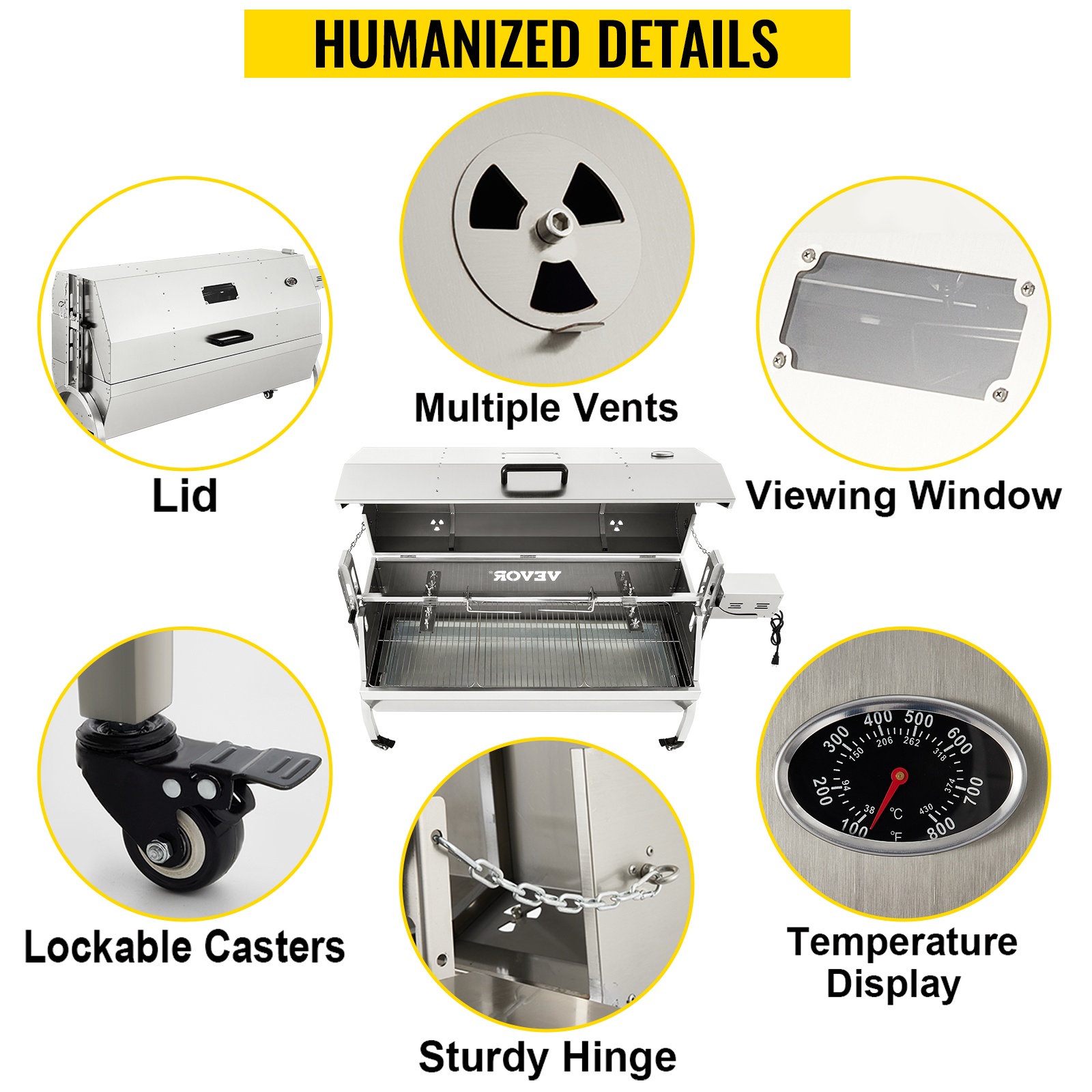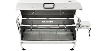 Grillivaunussa on lukittavat pyörät, useita jäähdytysaukkoja, tukijalat ja selkärankapiikit ruoan kiinnittämistä varten. Nämä yksityiskohdat parantavat turvallisuutta, käyttömukavuutta ja vartaan tasapainoa paiston aikana.