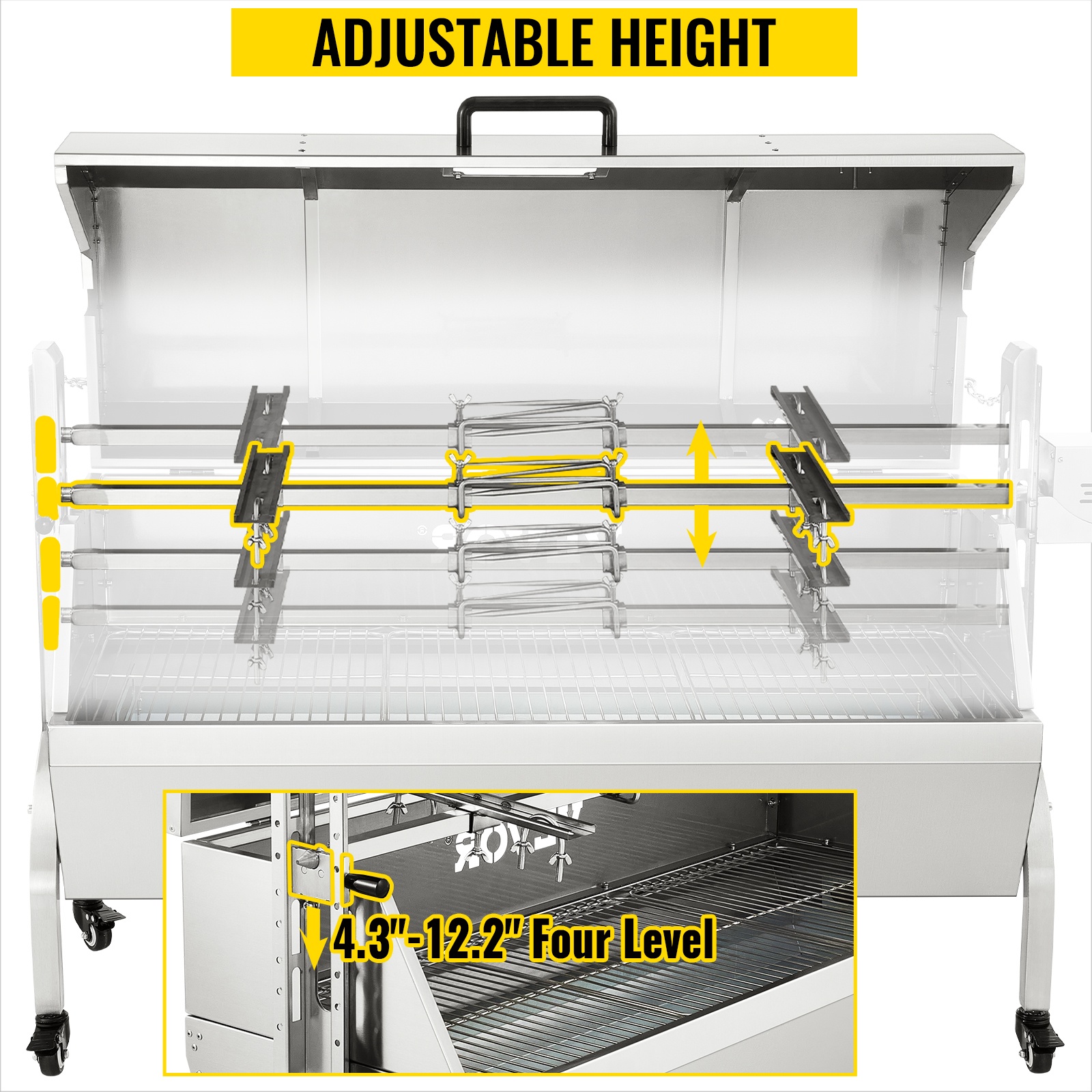 Pyörivä paistogrilli ruostumatonta ja sinkittyä terästä säädettävä vartaan korkeus lukittavat pyörät