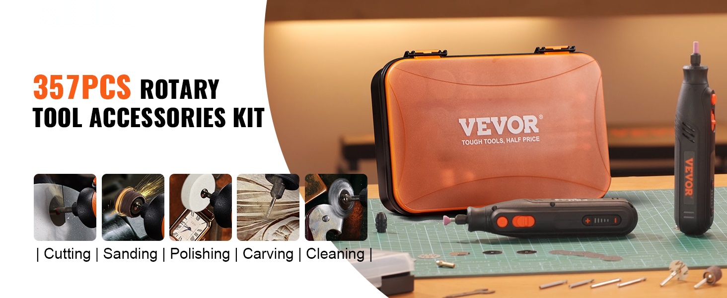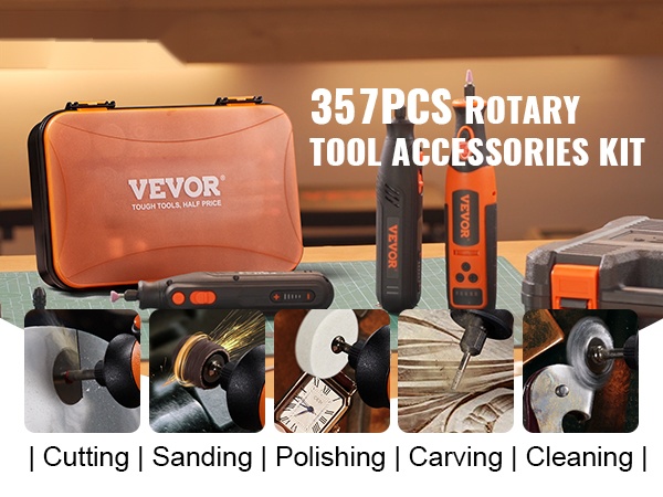 Monipuolinen 357-osainen pyörivän työkalun tarvikekokonaisuus tarjoaa runsaasti mahdollisuuksia sekä kodin pieniin parannustöihin että erilaisiin harrasteprojekteihin. Sarjasta löytyy tarvike lähes jokaiseen tarpeeseen, tarkasta leikkaamisesta ja hionnasta hienoon kiillotukseen ja viimeistelyyn.