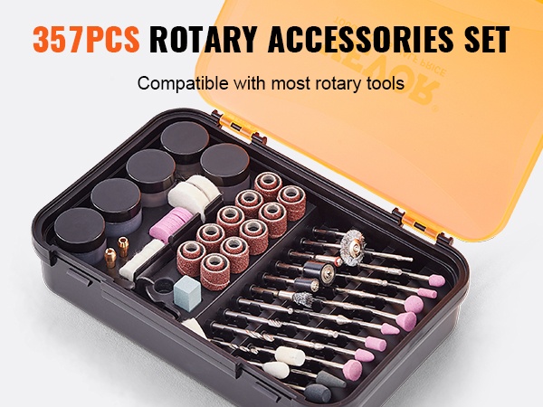 357-osainen sarja sisältää laajan valikoiman tarvikkeita, kuten timanttiterät, hiomalaikat, hiomakivet ja paljon muuta. Saat käyttöösi työkalut monenlaisiin tehtäviin, joten pakkaus on käytännöllinen lisä lähes mihin tahansa pyörivään työkaluun.