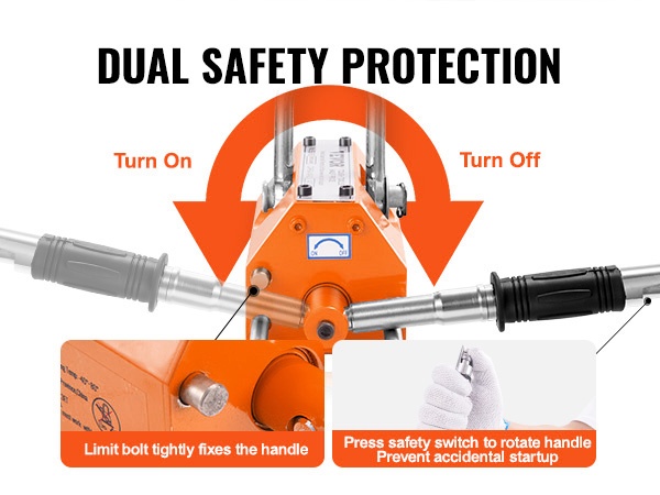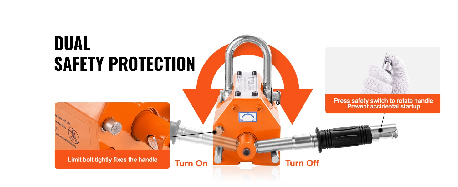 Kuormausmagneetissa on turvakytkimellä varustettu iskuja vaimentava kahva. Lukituspultti pitää kahvan tiukasti paikallaan nostojen aikana, mikä auttaa estämään tahattoman kytkimen vapauttamisen käytön aikana.