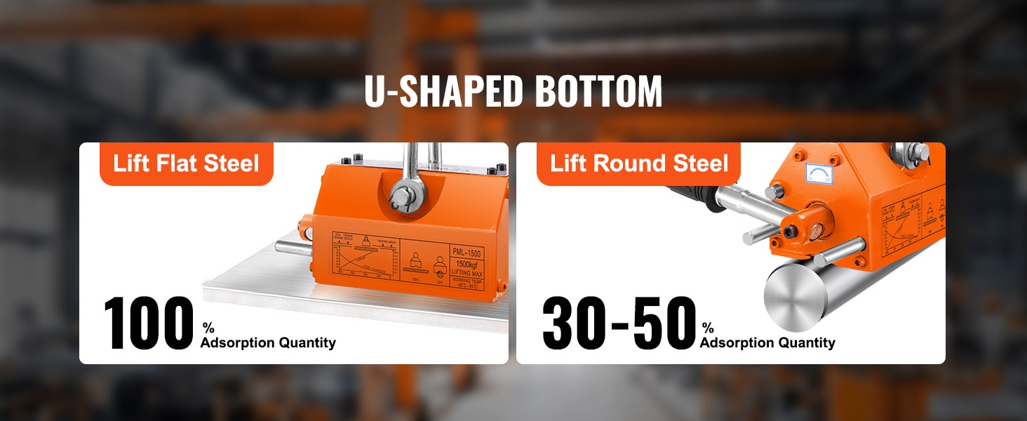 U-muotoinen pohja sopii sekä tasaisille että pyöreille teräspaloille. Pyöreiden teräskappaleiden kohdalla tartuntavoima on noin 30%–50% tasoteräkseen verrattuna, joten todellinen nostokyky riippuu kappaleen muodosta ja paksuudesta.