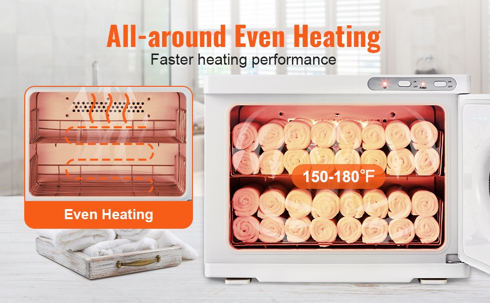Kaikilta sivuilta tapahtuva lämmitysjärjestelmä takaa tasaisen tuloksen. 360° tasaista lämmitystä hyödyntävä laite lämmittää pyyhkeet noin 150-180℉ (65.55-82.22℃) lämpötilaan noin 10 minuutissa.
