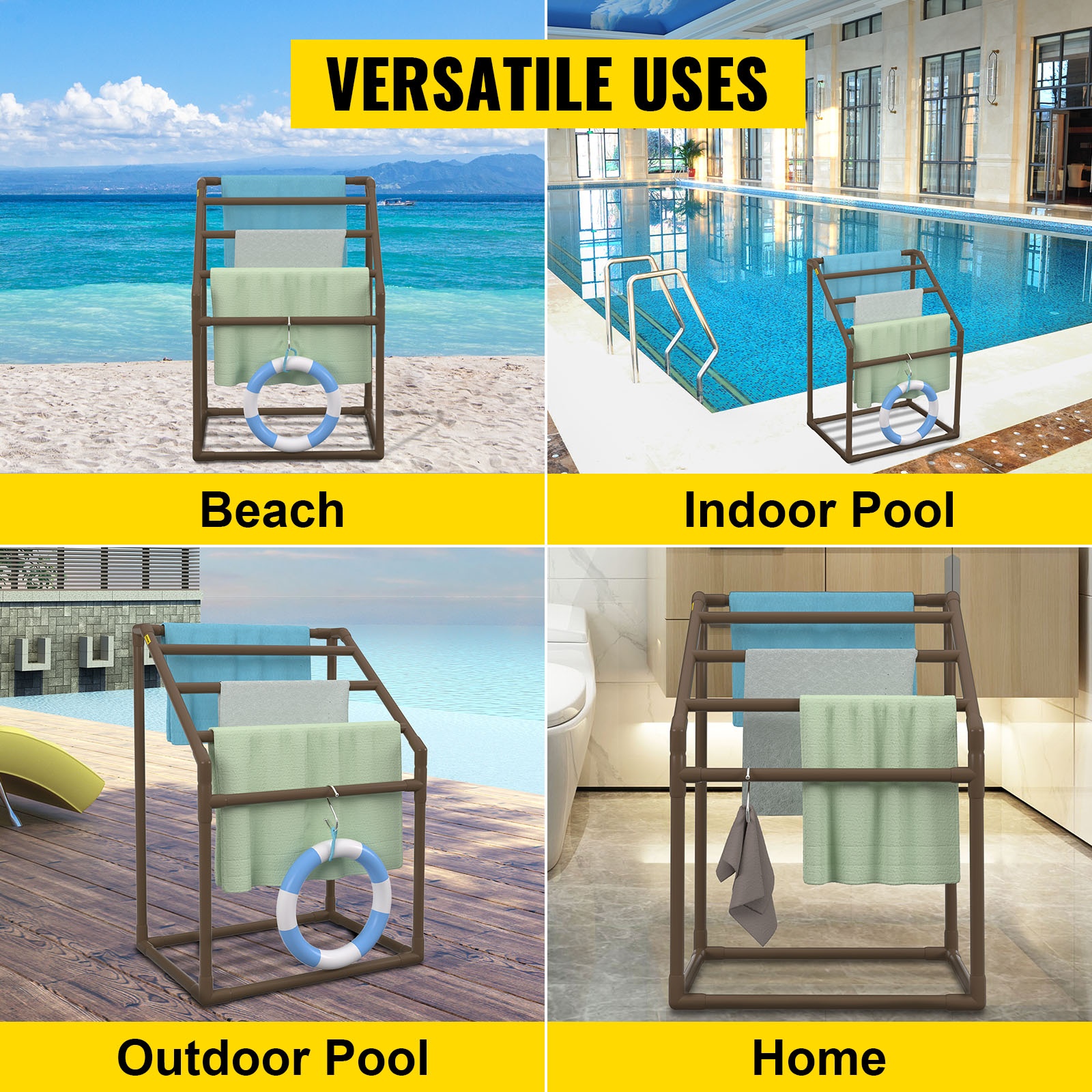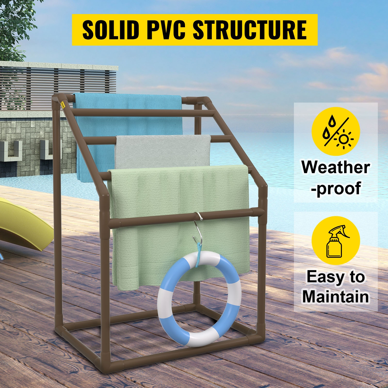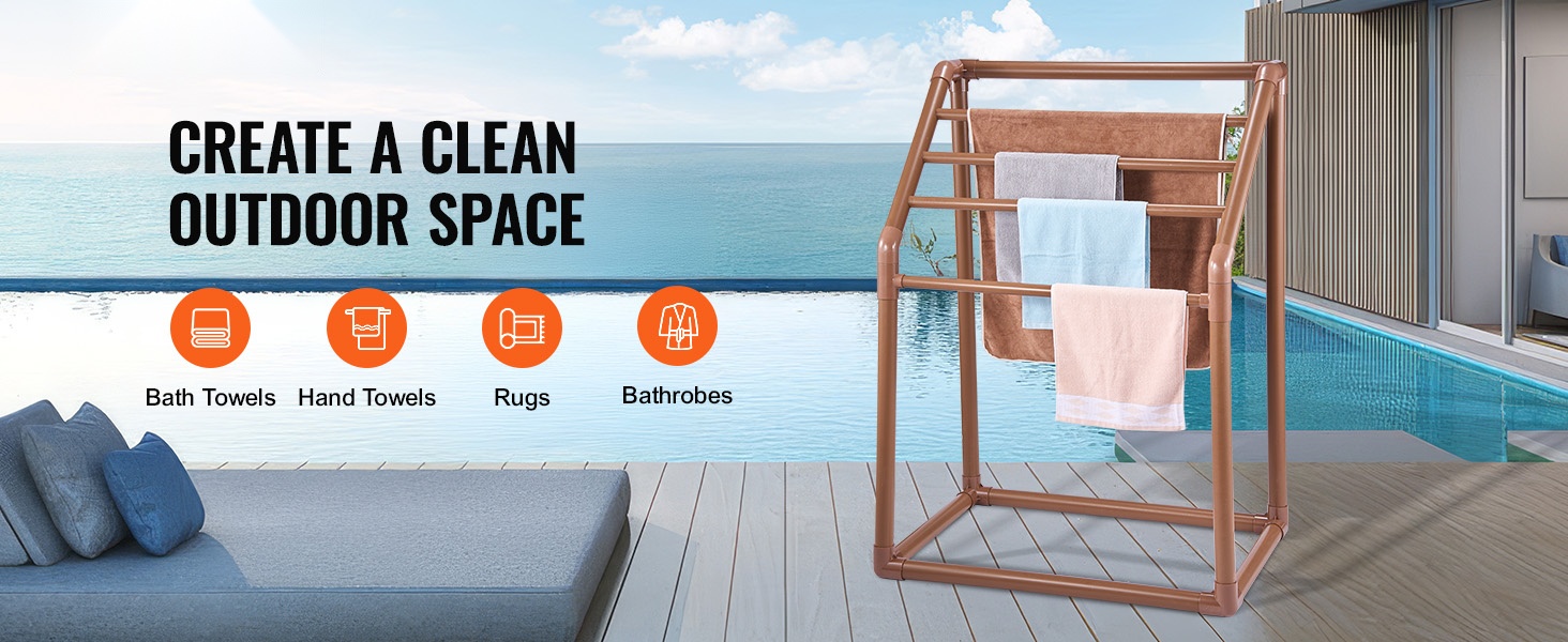 Pyyheteline tarjoaa käytännöllisen säilytysratkaisun uima-altaan, kylpylän tai terassin yhteyteen. T-mallinen, vapaasti seisova rakenne ja kestävä PVC-materiaali tekevät telineestä tukevan, säänkestävän ja helposti liikuteltavan. Useat poikkitangot ja lisävarusteet auttavat pitämään pyyhkeet, uimalelut ja varusteet järjestyksessä ja hyvin tuulettuvina.