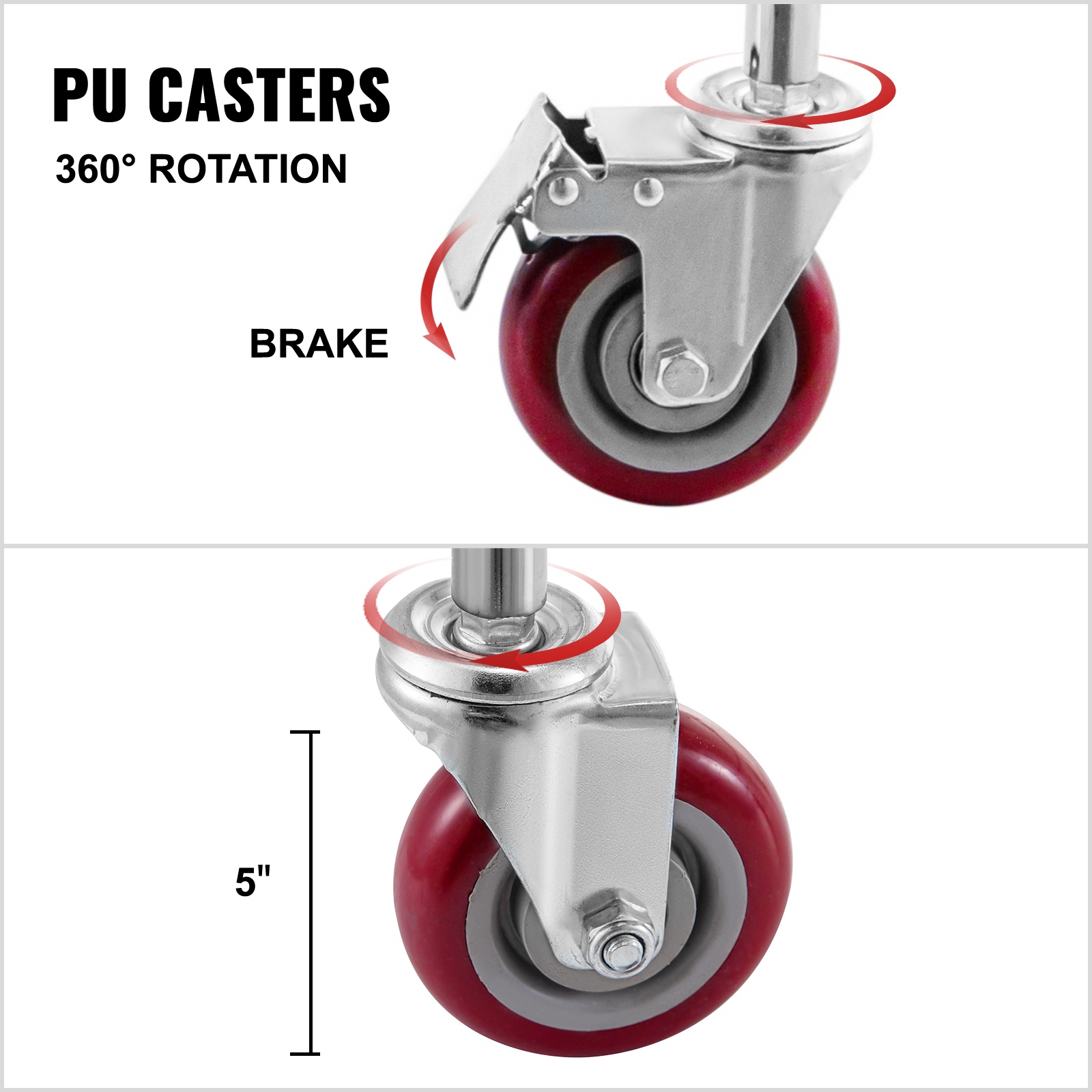 5'' kääntyvät pyörät on valmistettu kitkaa vähentävästä PP-materiaalista, joka suojaa lattiaa. Jarrulliset pyörät parantavat kärryn vakautta pysäytettäessä.