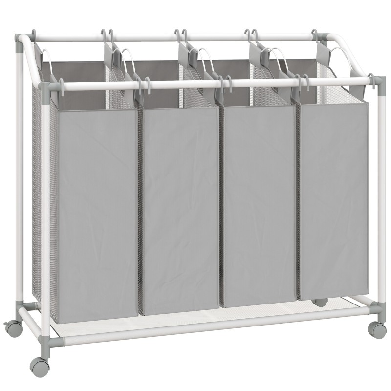 Pyykkivaunu 4-osastoinen 160 L metallirunko Oxford-kangaspusseilla 97 x 38 x 81 cm harmaa-valkoinen
