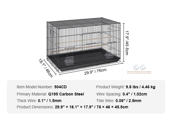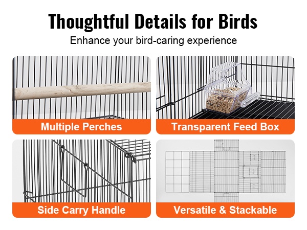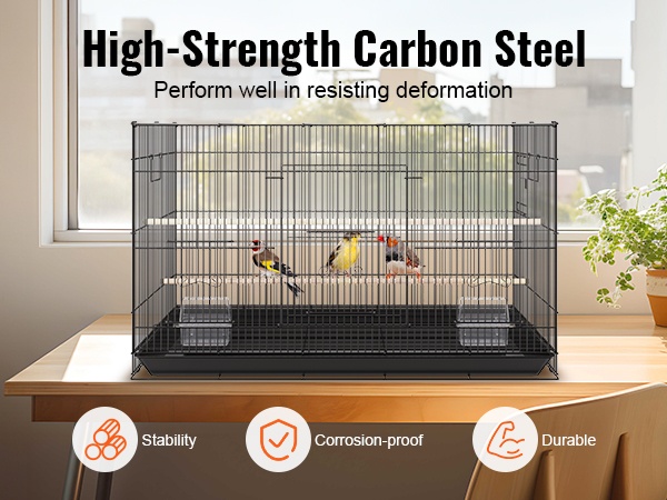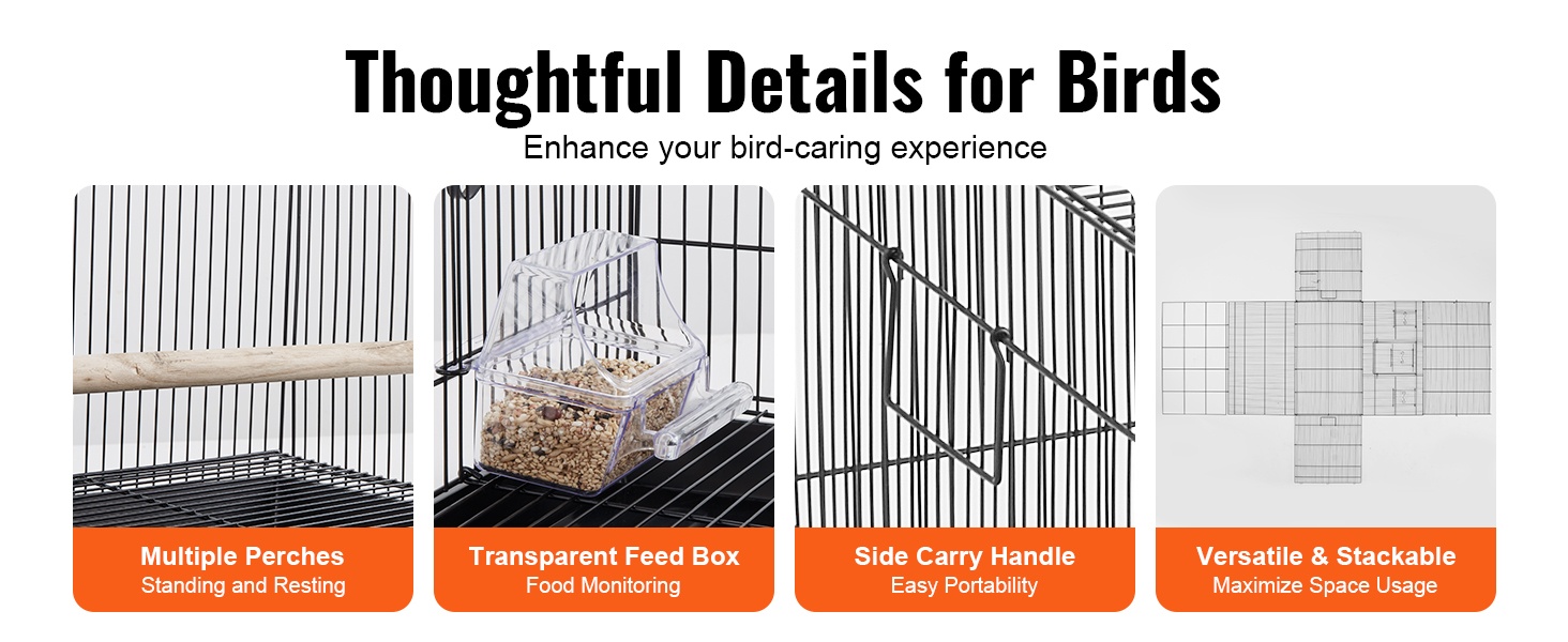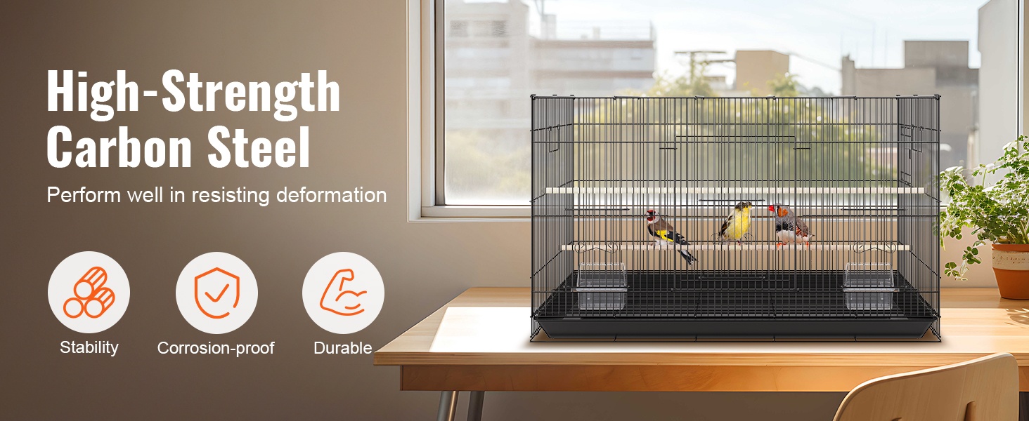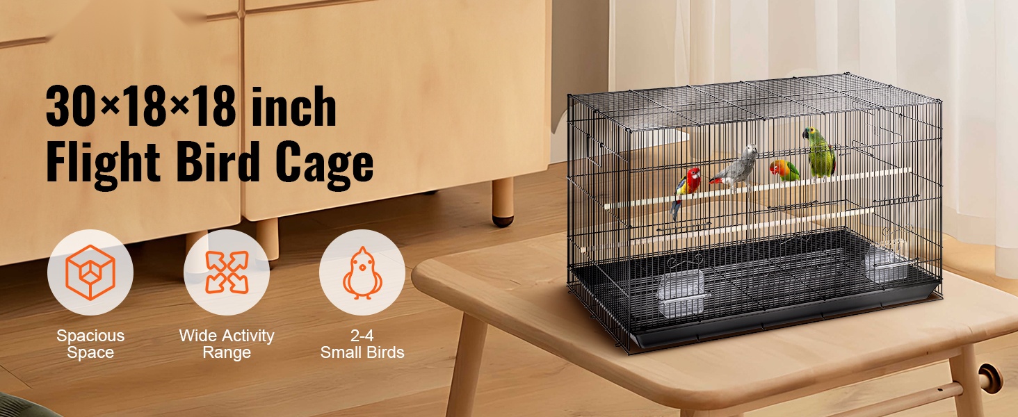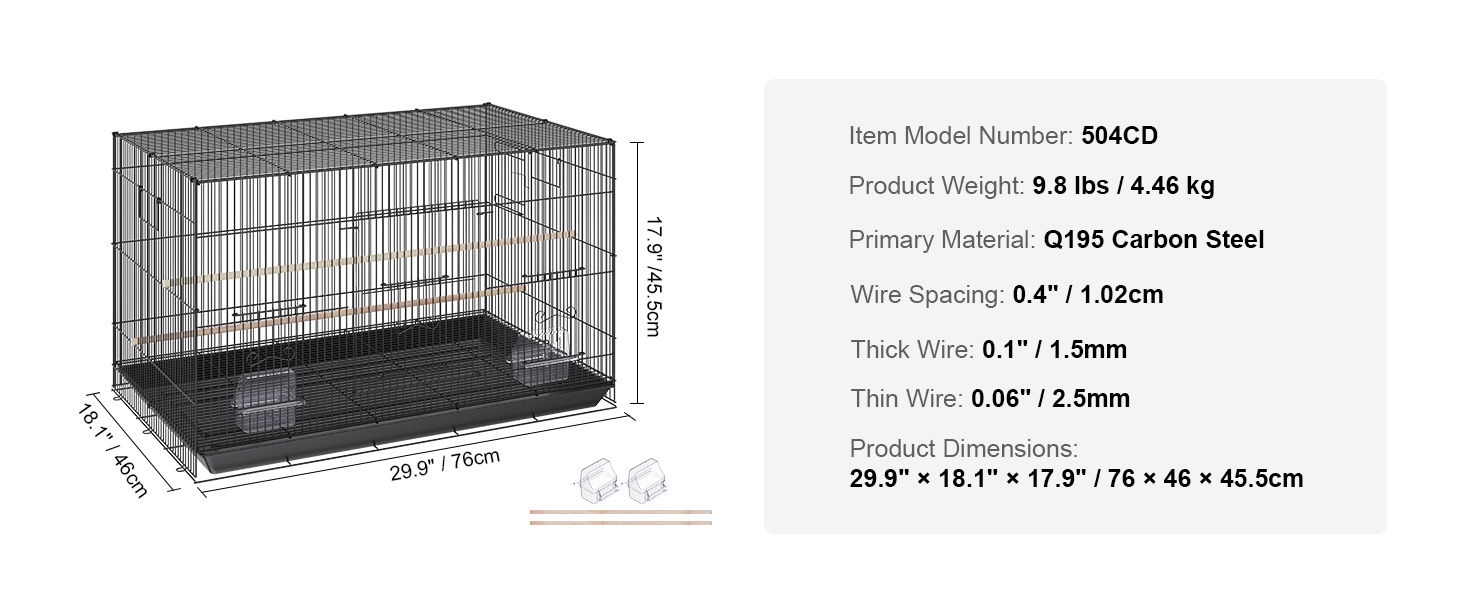 Mitat 29.9"L x 18.1"W x 17.9"H ja 0.4'' verkon silmäkoko tarjoavat runsaasti tilaa 2–3 keskikokoiselle tai suurelle linnulle hyppimiseen, liikehtimiseen ja luontaisten vaistojen toteuttamiseen. Häkkiin mahtuu useita orsia, leluja ja ruokakuppeja, mikä lisää virikkeitä ja tekee ympäristöstä monipuolisen.