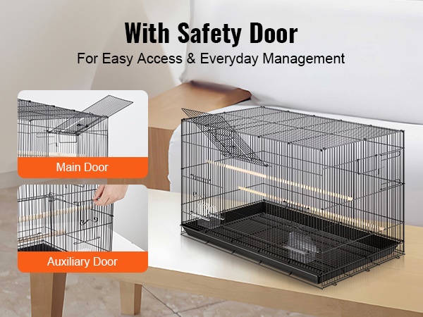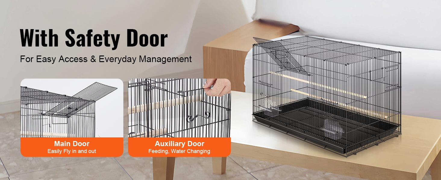 Pääovessa on turvallisuutta korostava rakenne, joka helpottaa hoitajan pääsyä häkkiin ruokintaa, puhdistusta ja kunnossapitoa varten, samalla karkailua ehkäisten. Erillinen lisäovi helpottaa ruoan ja veden lisäämistä arjessa.