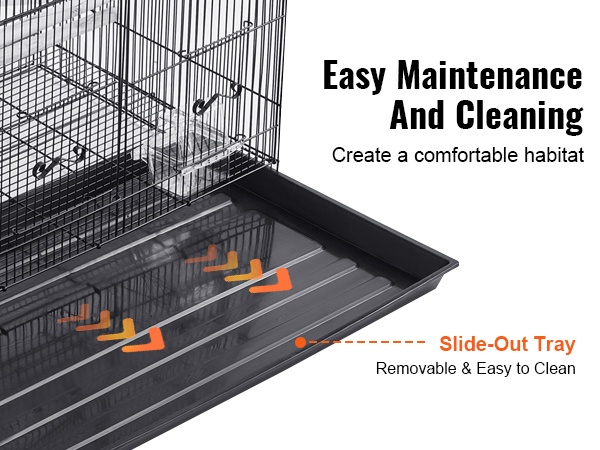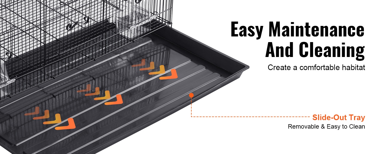 Irrotettava tarjotin, jossa on vedenkestävä pinnoite, tekee puhdistuksesta vaivatonta. Verkko-osuus erottaa lemmikit jätteestä, jolloin linnut eivät pääse suoraan kosketuksiin ulosteiden kanssa, ja pohjalle kertyvät jätökset on helppo poistaa. Näin häkki pysyy raikkaana ja siistinä.