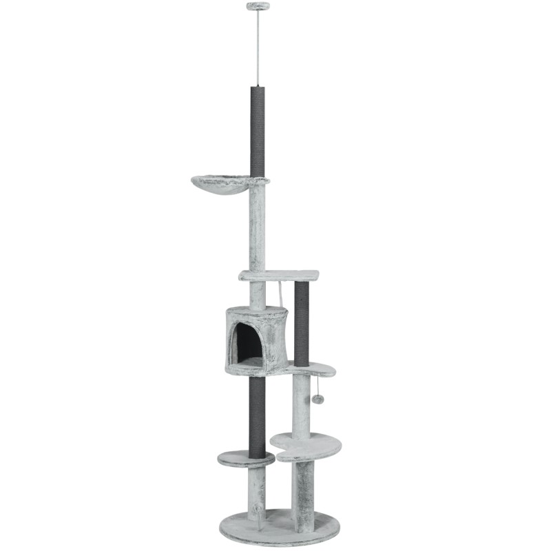 - Korkeussäädettävä rakenne: säädettävä korkeus 225–255 cm, kiristettävä kattotuki pitää raapimapuusta tulevan kiipeilytornin tukevasti paikoillaan.