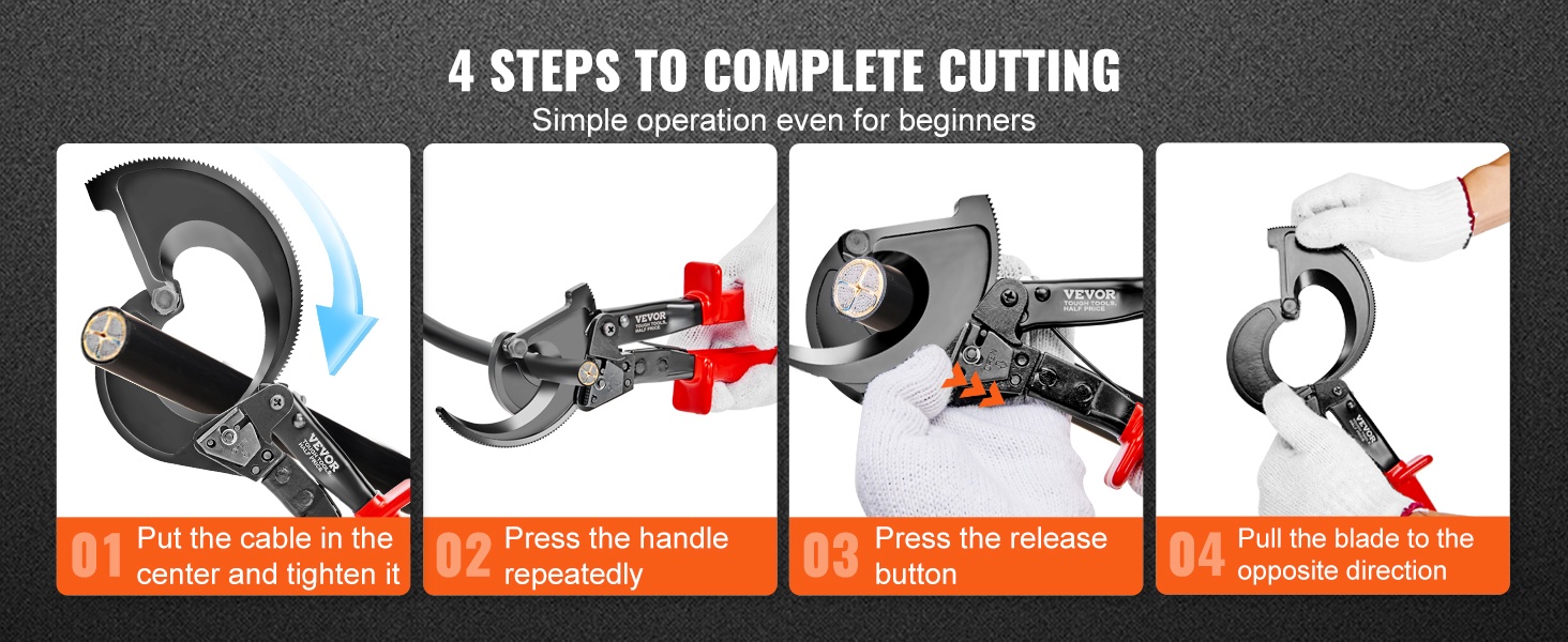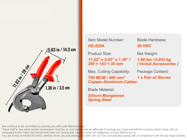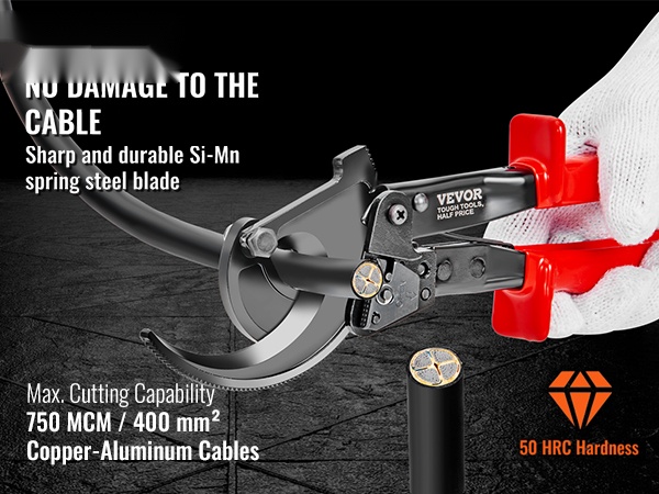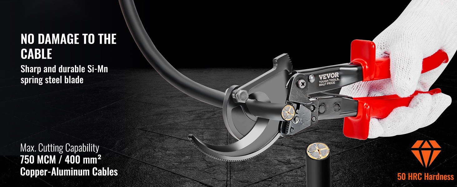 11" räikkäkaapelileikkuri kupari- ja alumiinikaapeleille jopa 400 mm² asti. Terä on valmistettu piimangaanijousiteräksestä, mikä mahdollistaa siistit, purseettomat katkaisupinnat ja pitkän käyttöiän. Kompakti rakenne ja kätevä pikalukituksen vapautus helpottavat käyttöä myös ahtaissa tiloissa.