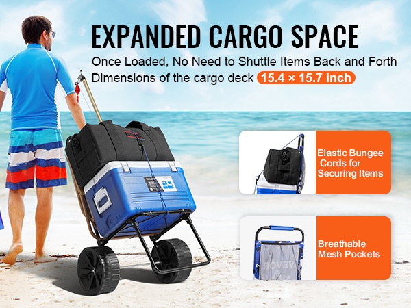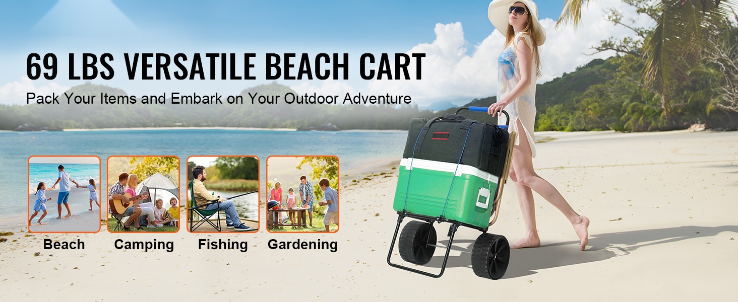 Vaunu on suunniteltu helpottamaan rantalomia ja ulkoilupäiviä. Se kuljettaa kylmälaukut, aurinkovarjot, viltit ja muut tarvikkeet yhdellä kertaa, joten et joudu tekemään useita kantokertoja pehmeässä hiekassa.