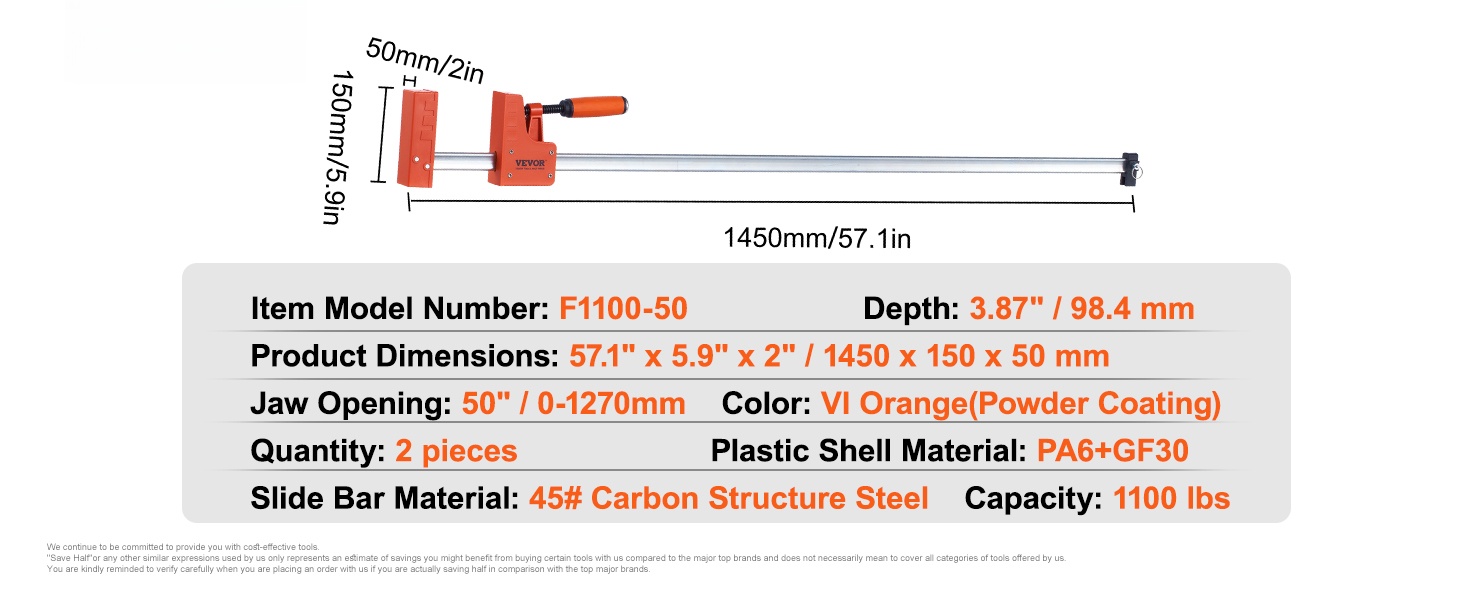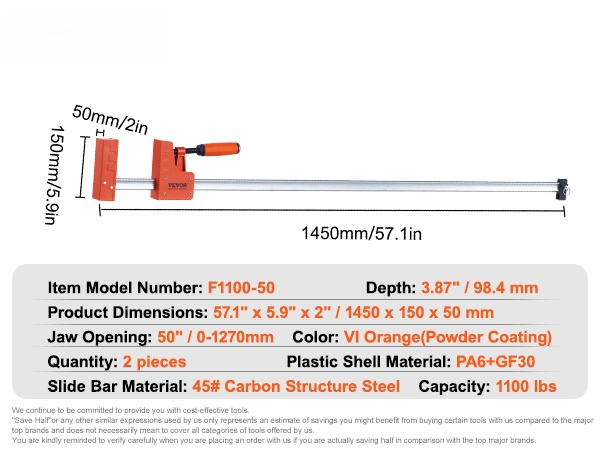 Rinnakkaispuristin F1100-50 puu- ja metallityöhön 1270 mm 499 kg 2 kpl