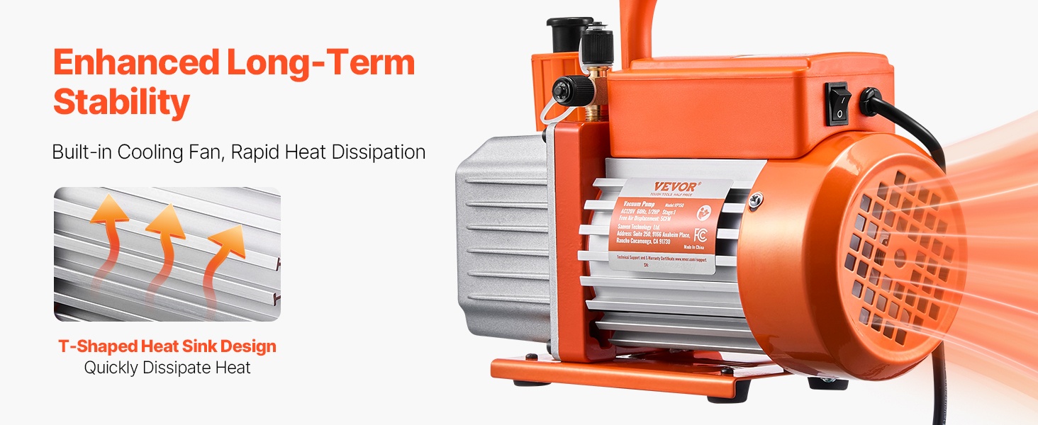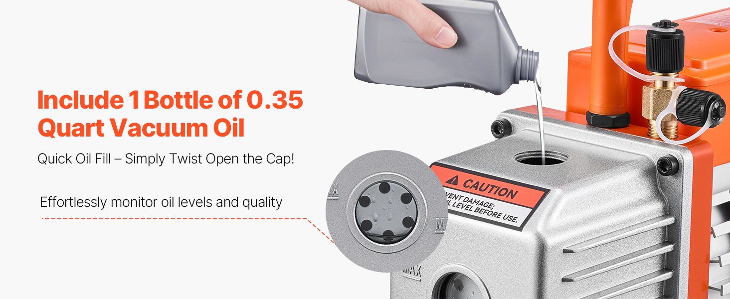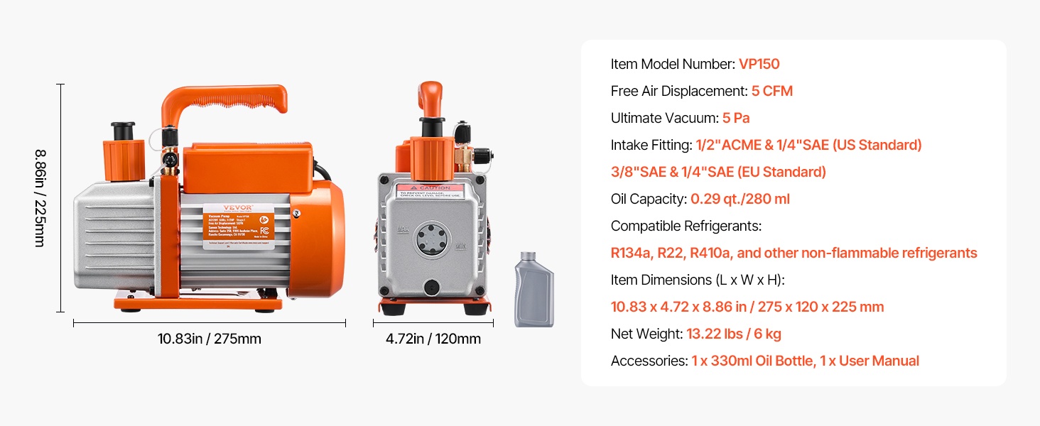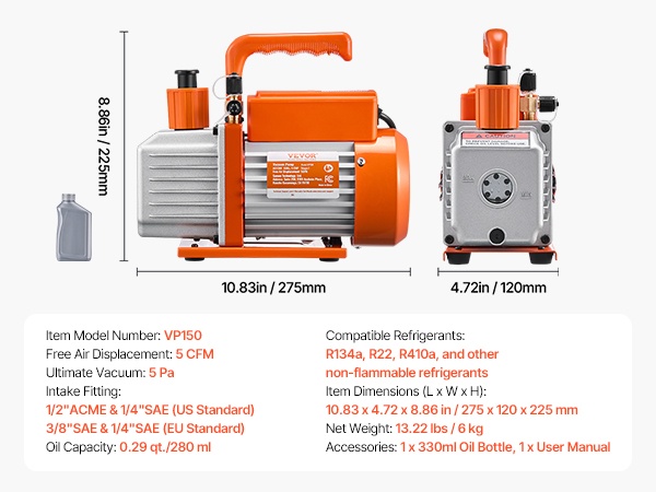 Tämä 6 CFM HVAC-tyhjiöpumppu mahdollistaa nopean tyhjennyksen ja saavuttaa jopa 5 Pa:n loppualipaineen. Puhdas kuparimoottori, 1/4" SAE- ja 3/8" SAE -portit sekä mukana tuleva noin 0.35 qt tyhjiööpullo helpottavat auton ilmastoinnin ja pienempien HVAC-järjestelmien, kuten R22-, R134a- ja R410a-järjestelmien, huoltoa.