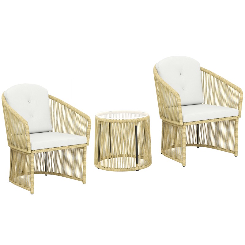 Rottinkityylinen bistrosetti ulkokäyttöön, 3-osainen puutarhakalustesetti, pöytä ja 2 tuolia, luonnonväri/cremevalkoinen