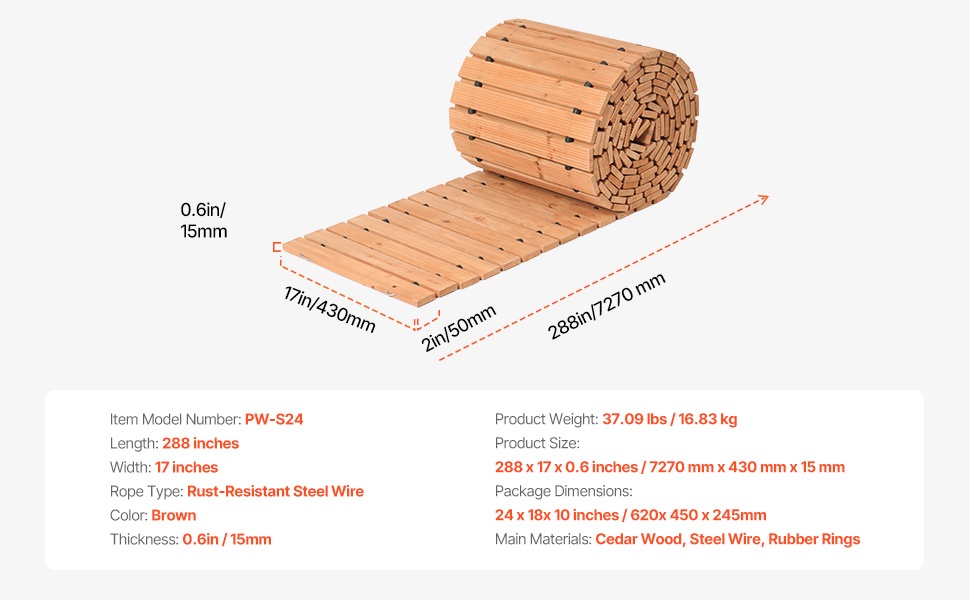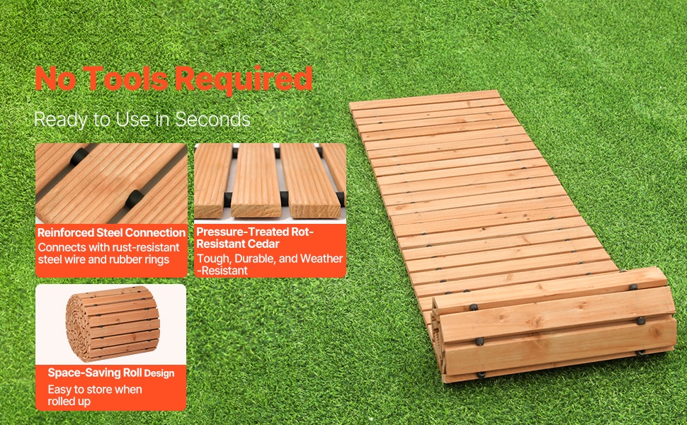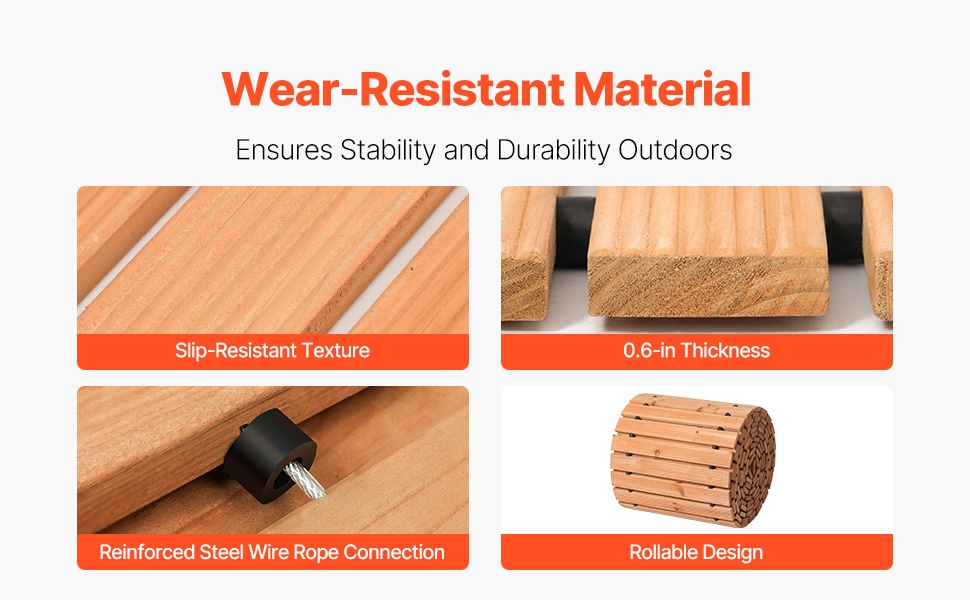 Tämä kaareva puinen puutarhapolku on käytännöllinen ja koristeellinen ratkaisu pihan kulkureiteille. Se auttaa pitämään jalat poissa mudasta ja tarjoaa tukevan, pitävän kävelyalustan esimerkiksi puutarhaan, terassille tai tilaisuuksiin ulkona. Rullattava rakenne ja teräsvaijerikiinnitys tekevät polusta helpon säilyttää ja siirtää paikasta toiseen.