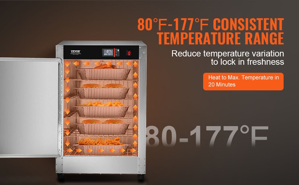 Lämpötila-alue 80℉–177℉ mahdollistaa sopivan ylläpitolämpötilan valitsemisen eri ruokalajeille. Lämpötilavaihtelut pysyvät pieninä, mikä auttaa säilyttämään maun ja ravintoarvon.
