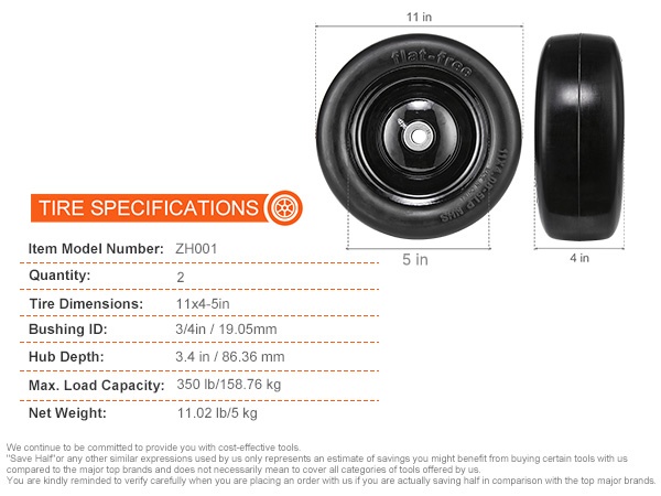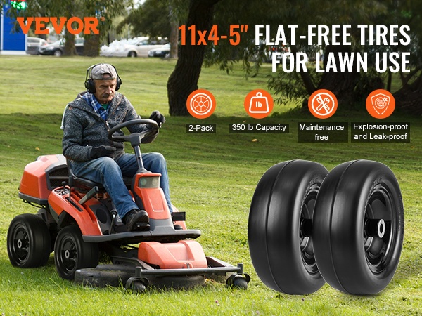 2 kappaleen pakkaus 11x4-7" ruohonleikkurin renkaita enimmäiskuormalla 350 lb (per rengas). Räjähdyssuojattu ja vuotamaton PU-materiaali mahdollistaa käytön ilman ilmanpaineen tarkistamista tai huoltoa.