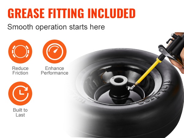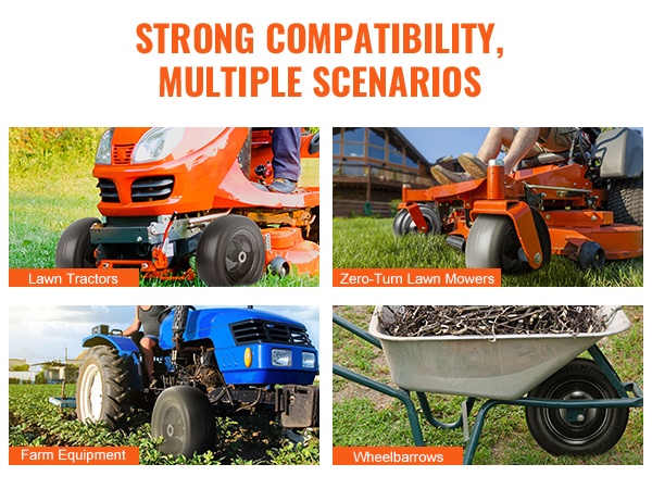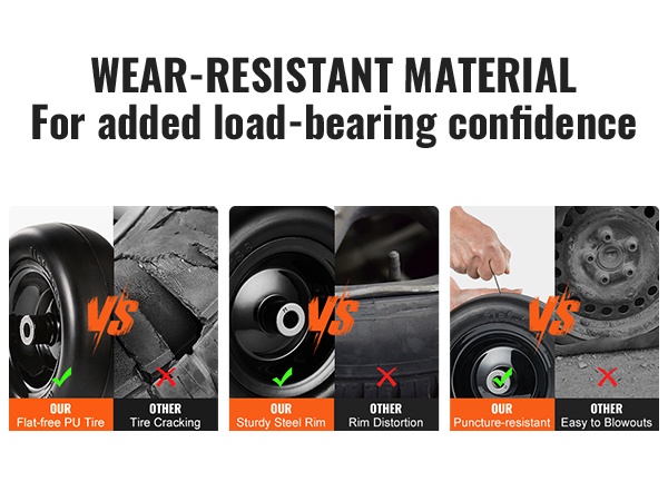 Kiinteät PU-renkaat ja teräksiset vanteet kestävät halkeamia, muodonmuutoksia ja puhkeamisia. Rakenne tarjoaa luotettavan kantavuuden ja tasaisen rullauksen erilaisilla piha- ja puutarhapinnoilla.