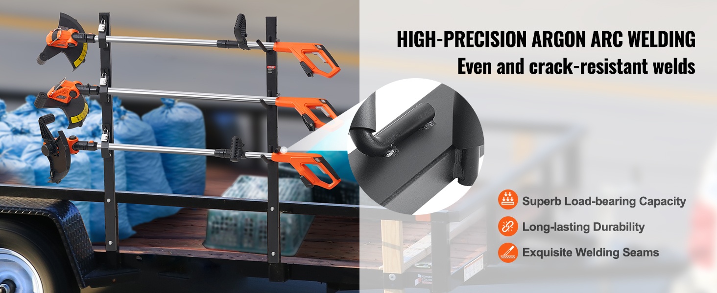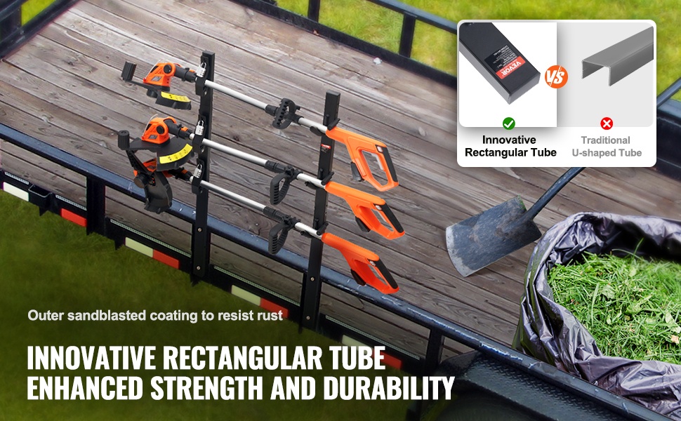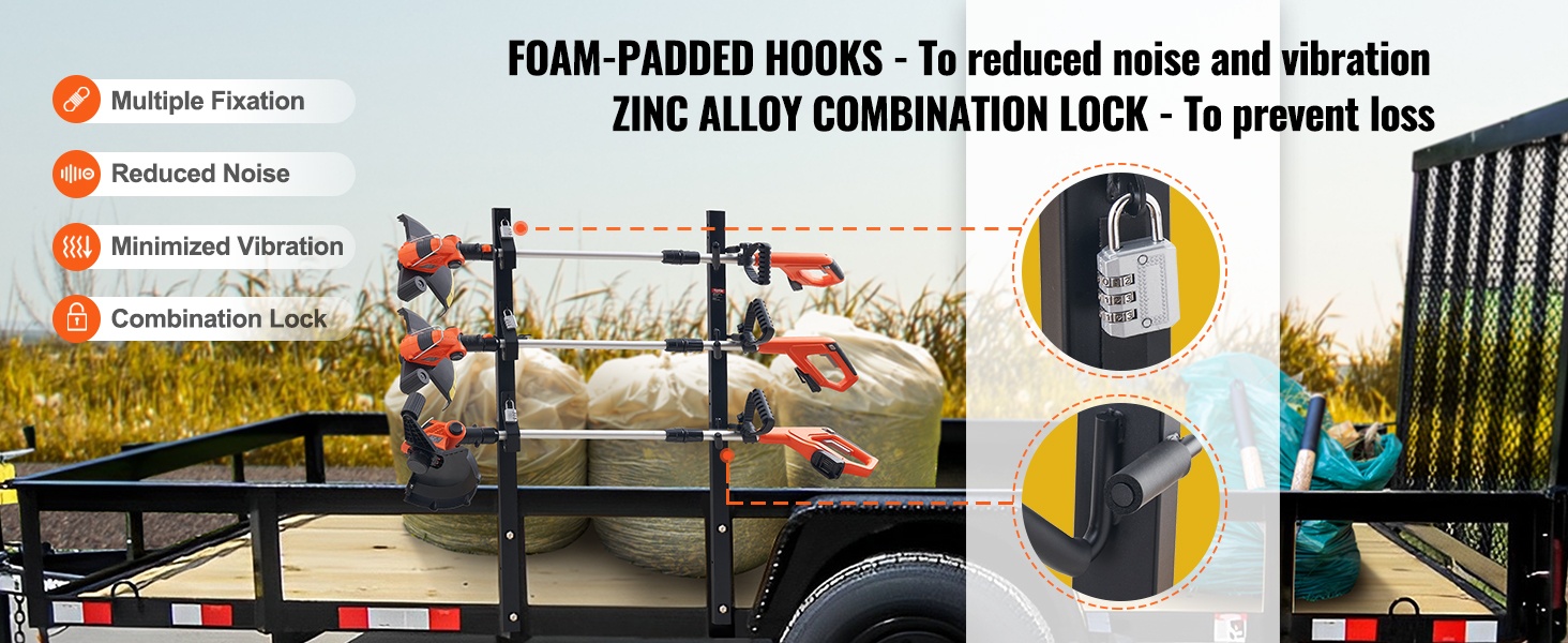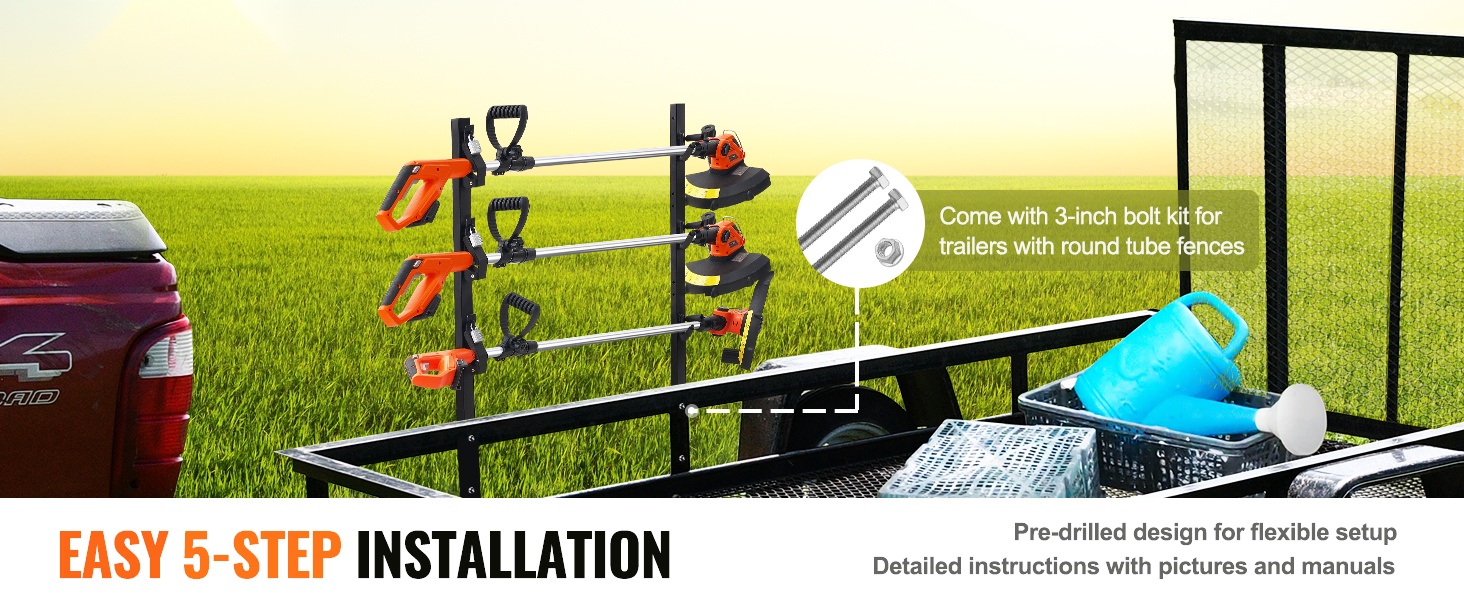 Tämän trimmeritelineen avulla pidät ruohotrimmerit ja muut puutarhatyökalut siistissä järjestyksessä perävaunussa tai ajoneuvossa. Esiporattu rakenne helpottaa lisävarusteiden kiinnittämistä ja tekee järjestelyn joustavaksi eri työtehtäviin.