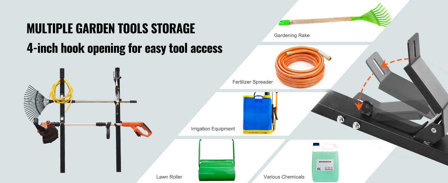 Koukut avautuvat jopa 4", joten niihin on helppo ripustaa erilaisia ruohotrimmereitä ja muita puutarhatyökaluja. Monikäyttöinen rakenne helpottaa työkalujen nopeaa esilleottoa ja takaisin asettamista.