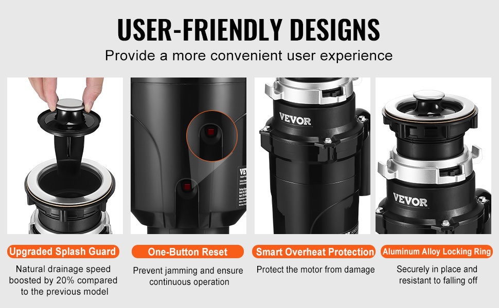 Manuaalinen nollauspainike auttaa tilanteissa, joissa laite juuttuu. Älykäs ylikuumenemissuoja suojaa moottoria vaurioilta. Päivitetty roiskesuoja vähentää roiskeita ja pitää altaan ympäristön siistimpänä.