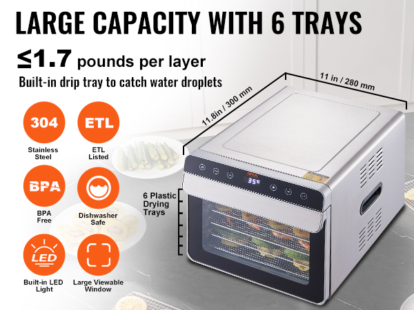 Kuivurissa on 6 elintarvikekelpoista tasoa. Jokaisen tason koko on 11.8 x 300 x 280 mm, ja tasolle suositellaan enintään 1.7 paunan kuormaa. Runko on 201 ruostumatonta terästä ja tarjottimet 304 ruostumatonta terästä. Kaikki käytetyt materiaalit ovat BPA-vapaita ja ETL-sertifioituja.