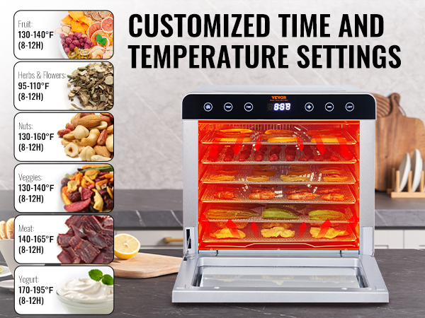 Lämpötila-asetukset kattavat alueen 95ºF–185ºF, ja ajastin voidaan asettaa enintään 48 tunniksi. Suurikokoinen kuivuri huolehtii 360° perusteellisesta ja tasaisesta kuivauksesta ilman pyöritystä. Laitteessa on myös ylikuumenemissuoja, automaattinen jäähdytys ja automaattinen sammuminen.
