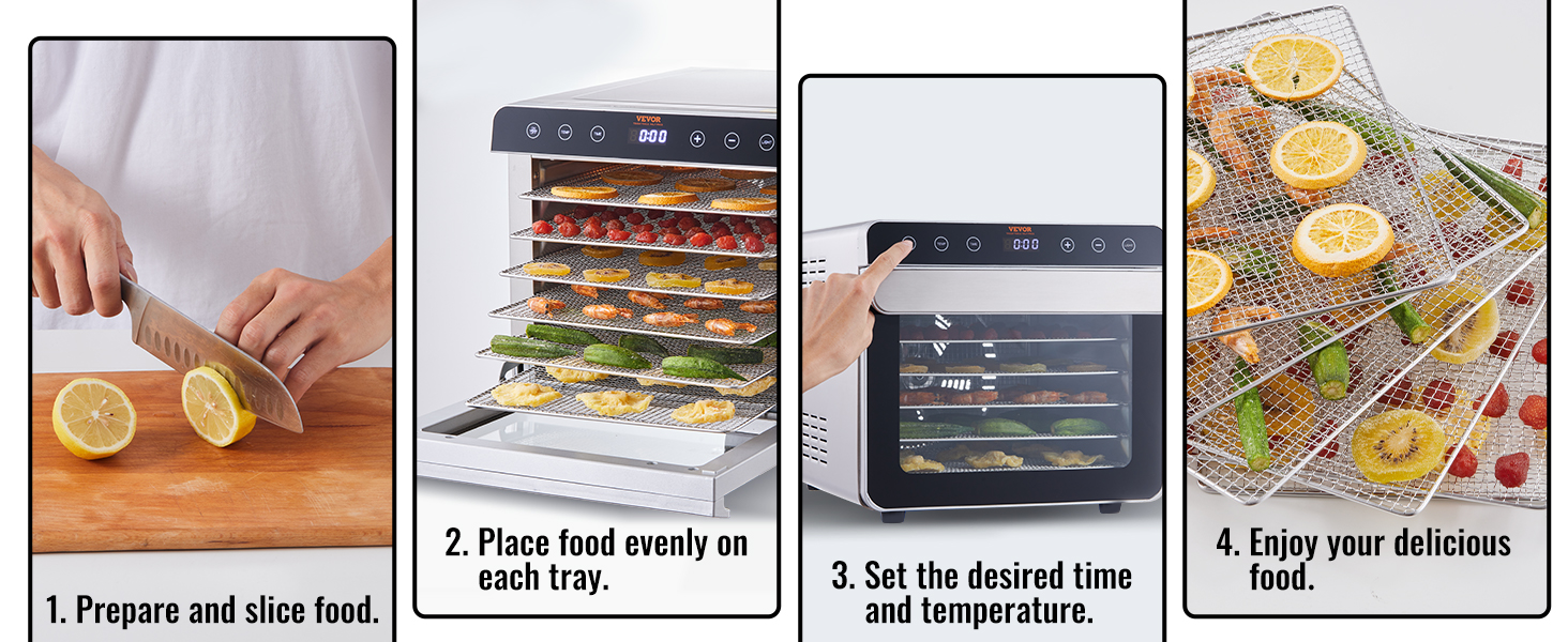 Kuivurissa on sisäänrakennettu LED-valo ja läpinäkyvä ikkuna, joiden ansiosta voit seurata kuivauksen etenemistä milloin tahansa. Muutamalla yksinkertaisella vaiheella saat valmiiksi maukkaita kuivattuja ruokia.