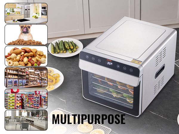 Tällä 700W ruostumattomasta teräksestä valmistetulla ruokakuivurilla kuivaat hedelmät, vihannekset, lihat, sienet, yrtit ja pähkinät hellävaraisesti. 6 ruostumattomasta teräksestä valmistettua tasoa ja 360° ilmankierto takaavat tasaisen kuivauksen ilman ruokien kääntämistä. Läpinäkyvä ikkuna ja sisäänrakennettu LED-valo helpottavat kuivauksen seuraamista.