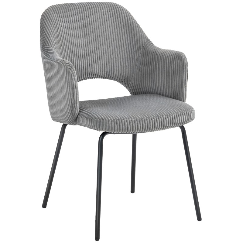 Pehmeällä vakosametilla verhoiltu ruokapöydän tuoli tuo ruokailutilaan lämpöä ja mukavuutta. Väljään, ammemaisesti muotoiltuun istuimeen on lisätty paksu vaahtomuovipehmuste, joka tukee selkää ja käsivarsia niin arkisilla illallisilla kuin kahvihetkillä ystävien kanssa. Tukevat metallijalat ja säädettävät jalkatassut pitävät tuolin vakaana myös hieman epätasaisella lattialla.