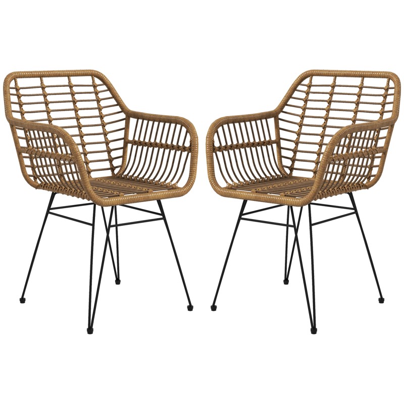 Tämä kahden boho-henkisen ruokapöydän tuolin setti tuo keittiöön tai ruokailutilaan luonnollista lämpöä ja kevyttä ulkotilan tunnelmaa. Kauniisti kaartuva istuinosa punotusta polyrottingista yhdistyy mustiin metallijalkoihin, ja kokonaisuus sopii yhtä hyvin ruokapöydän ääreen kuin olohuoneen lisätuoleiksi.