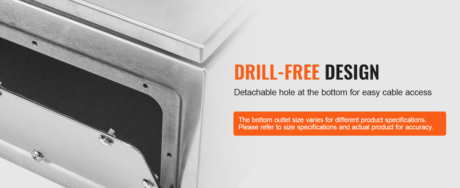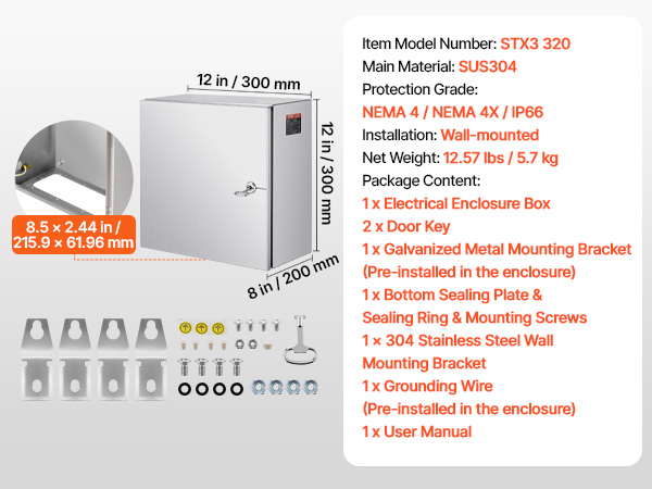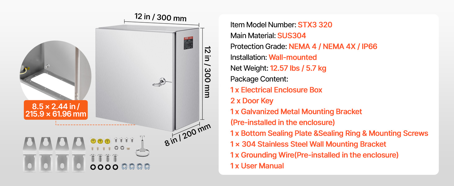 Tämä sähköasennuskotelo on valmistettu SUS304-ruostumattomasta teräksestä, joka on korroosionkestävä sekä sisä- että ulkotiloissa. Kotelo suojaa sähkölaitteita ja liitoksia pölyltä, roiskeilta ja sateelta IP66-suojausluokan sekä NEMA 4/NEMA 4X -luokituksen mukaisesti. Mukana tuleva asennuslevy helpottaa laitteiden ja kaapeloinnin järjestelyä.