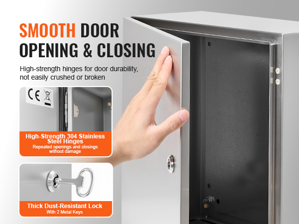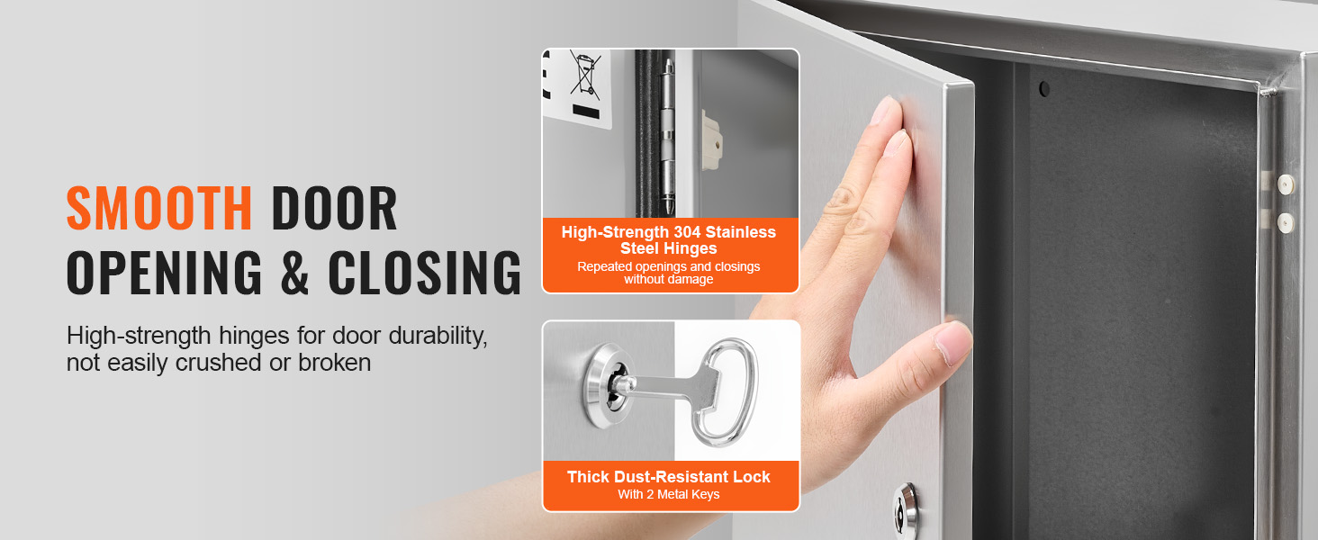 304-ruostumattomasta teräksestä valmistetut saranat mahdollistavat oven sujuvan avaamisen ja sulkemisen. Pölytiivis lukko vähentää lian ja pölyn pääsyä kotelon sisään ja auttaa suojaamaan komponentteja.