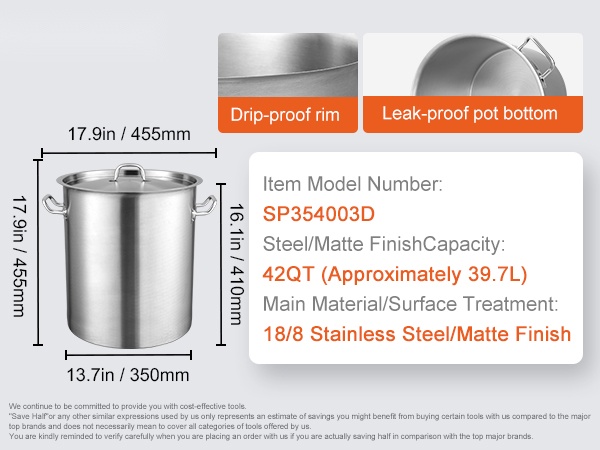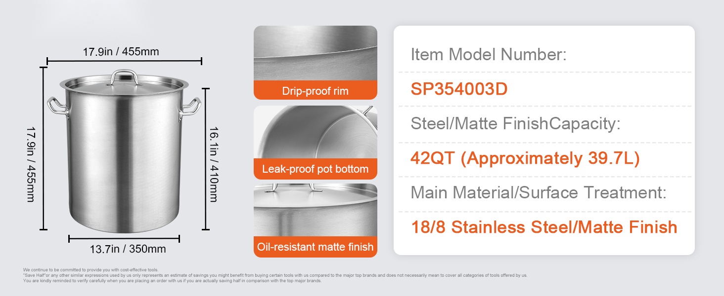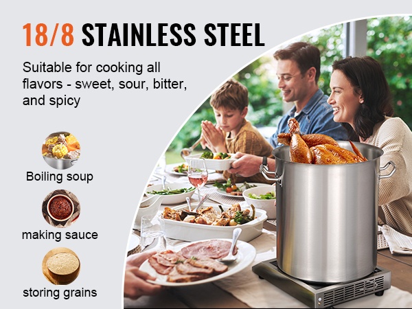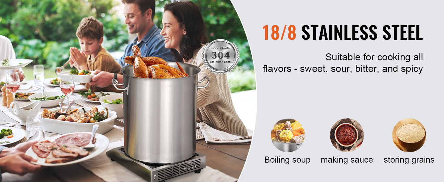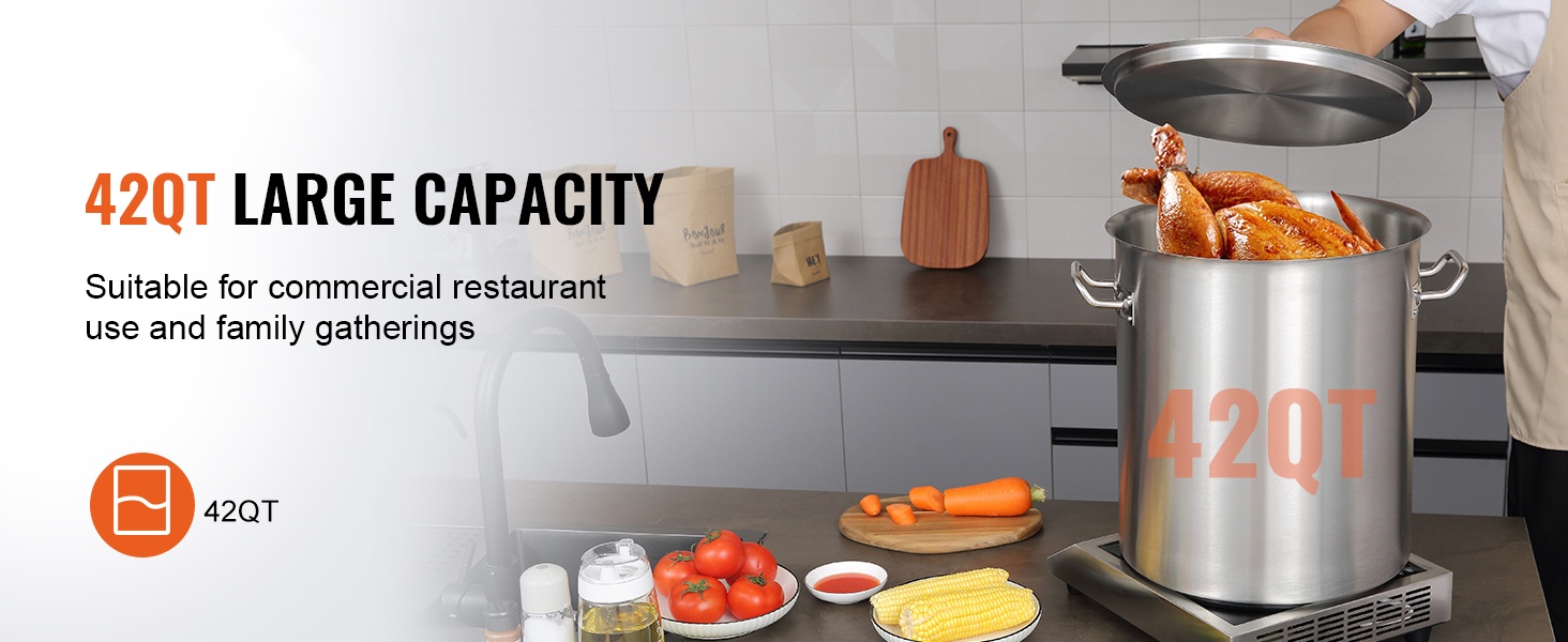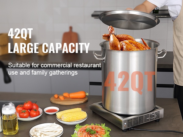 Suurikokoinen keittokattila sopii erinomaisesti keittojen, liemien ja muiden ruokien valmistamiseen suurille seurueille. Tilava 42QT (noin 39.7L) kapasiteetti mahdollistaa suurten ruokamäärien kypsentämisen kerralla, mikä säästää aikaa ja helpottaa tarjoilua tapahtumissa ja tilaisuuksissa.